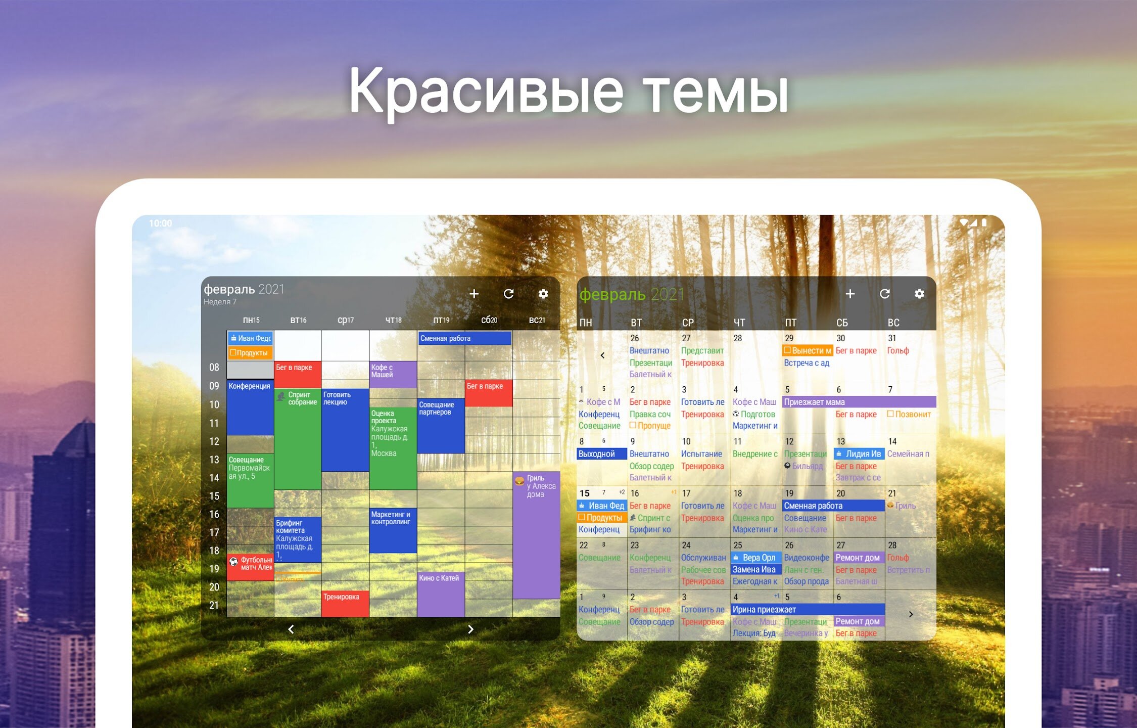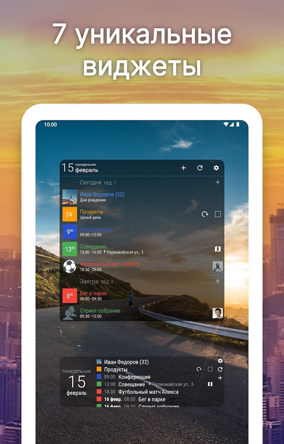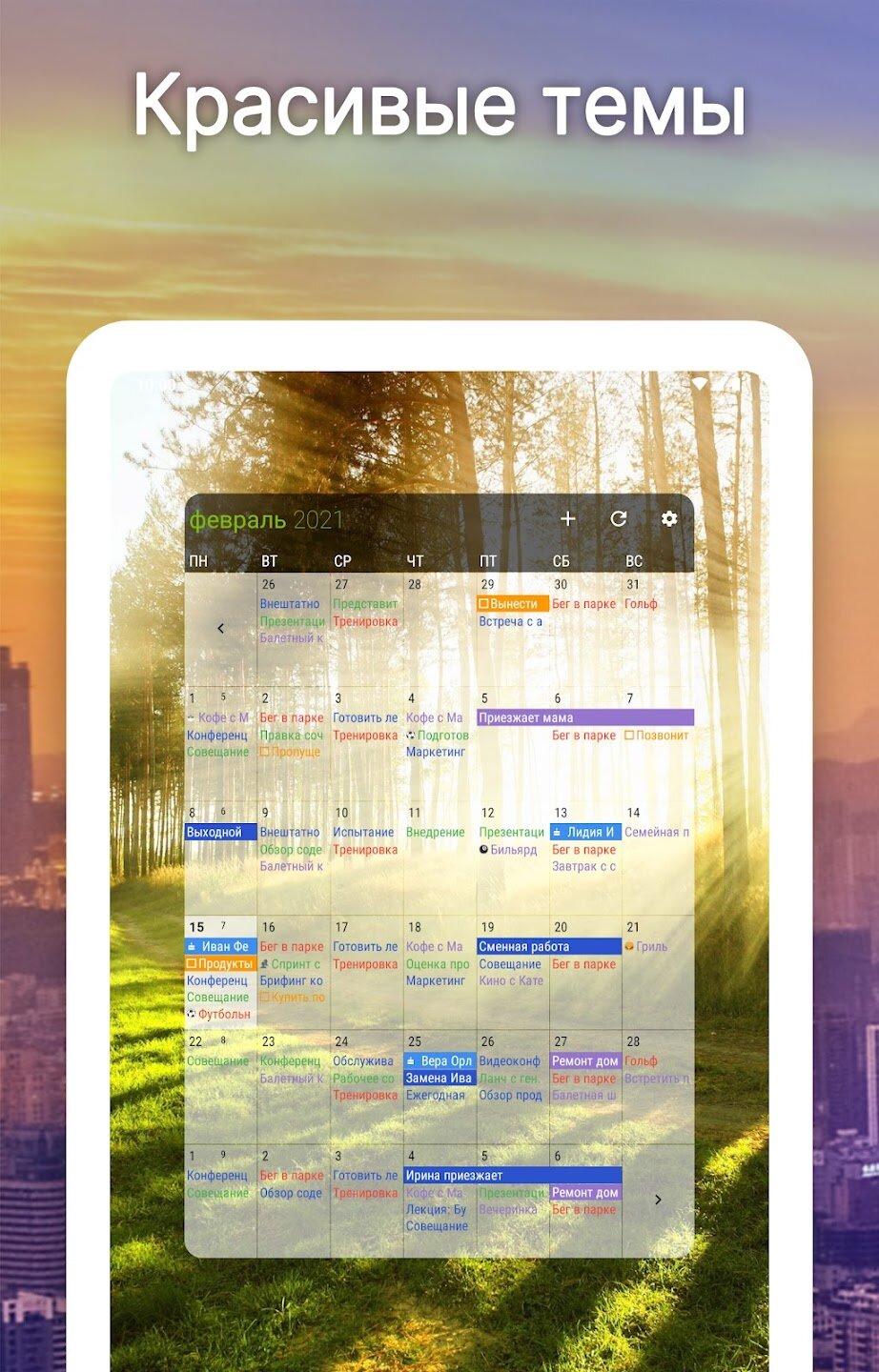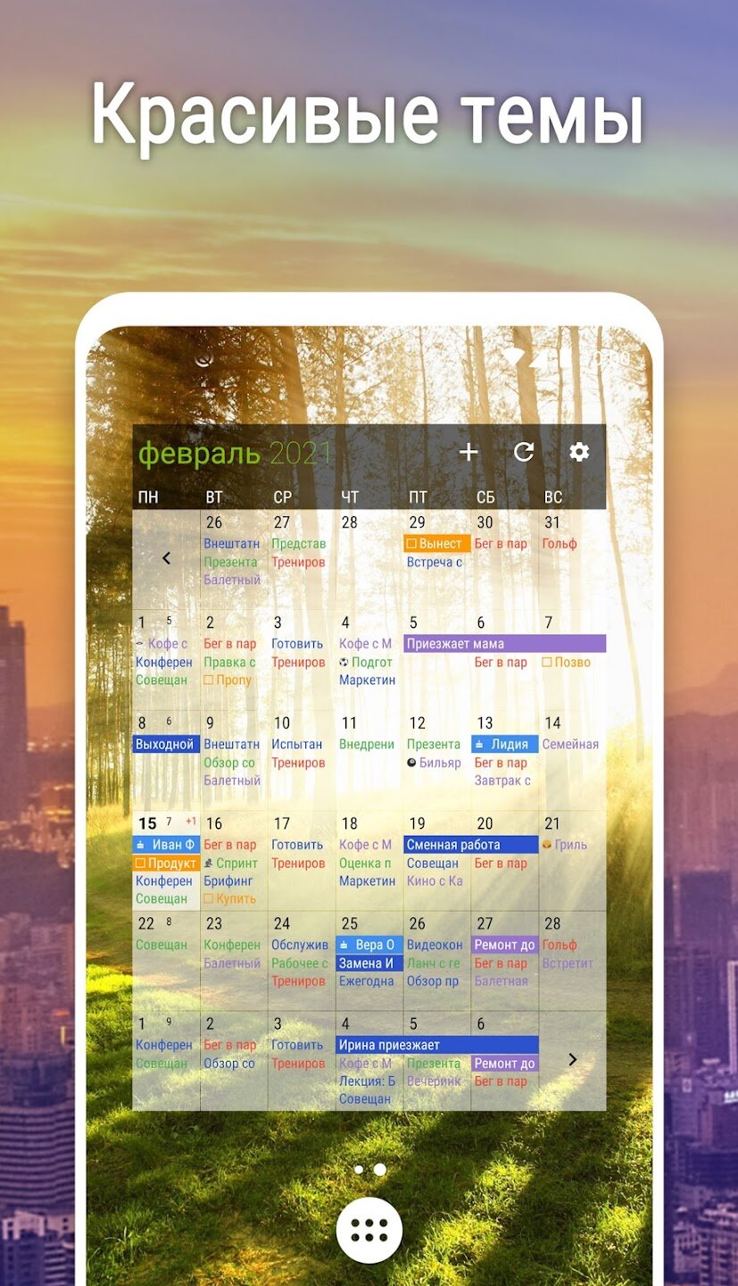 - Настраиваемые виджеты для повестки дня, недели, месяца и задач.