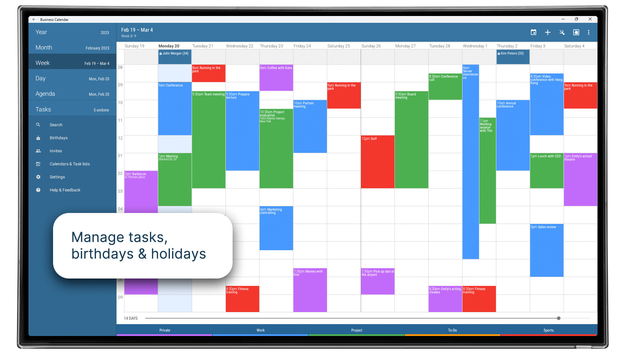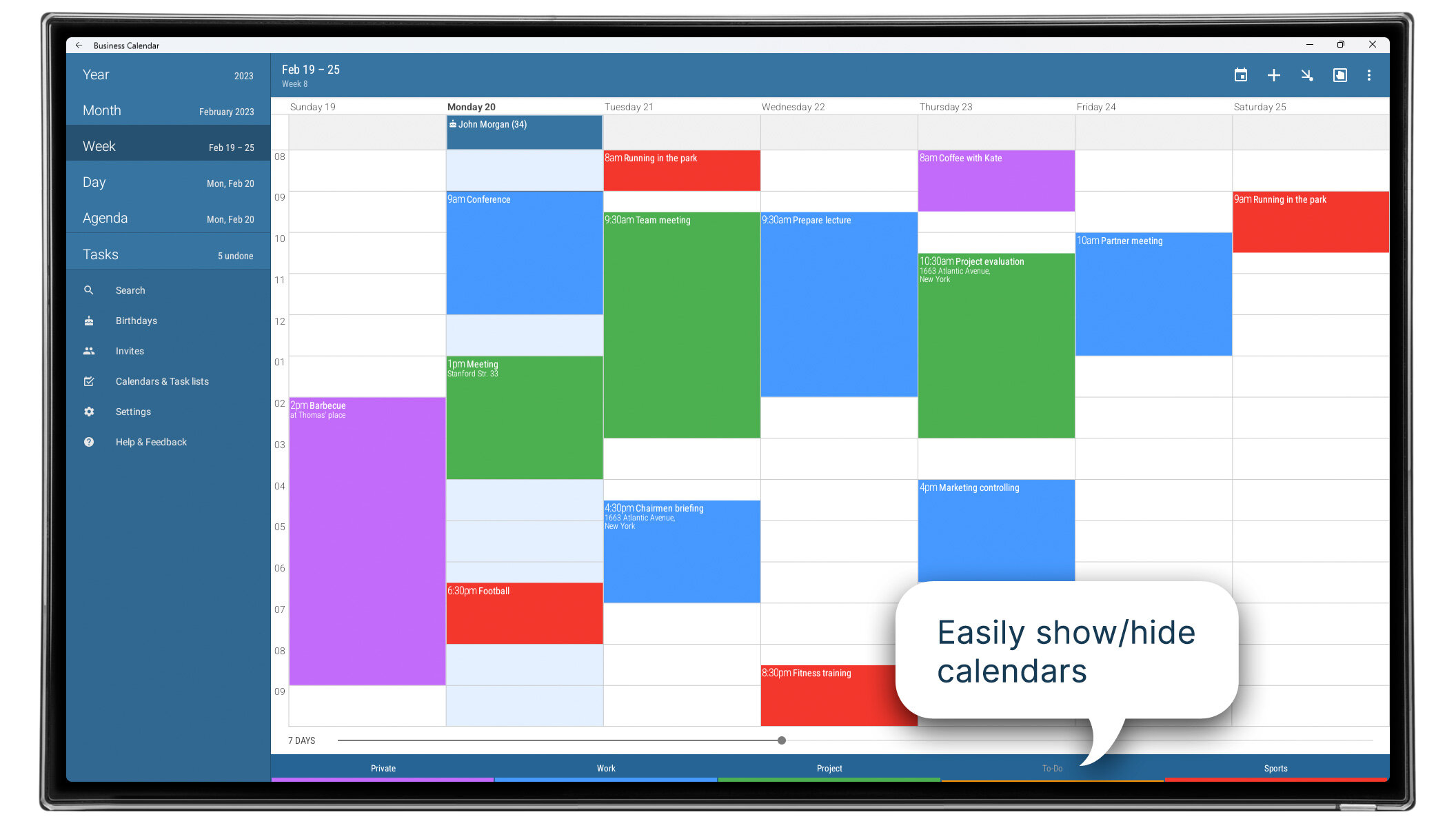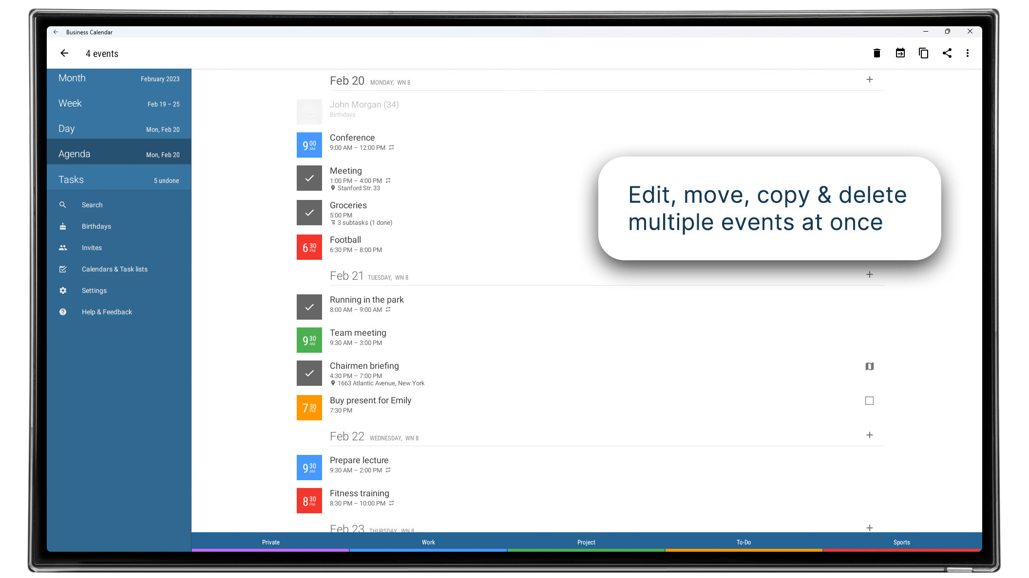 Business Calendar 2 объединяет календарь, ежедневник и органайзер в одном мощном инструменте. Оно предлагает шесть основных видов просмотра — «Месяц», «Неделя», «День», «Повестка дня», «Год» и «Задачи» — что дает вам четкое представление о ваших обязательствах. Приложение имеет гибкий дневник для планирования от 1 до 14 дней и предоставляет красивые настраиваемые виджеты для вашего домашнего экрана. Безупречная синхронизация гарантирует, что ваши события всегда будут актуальными в Google Calendar, Microsoft Exchange и Outlook, а интуитивные жесты позволяют быстро перемещаться между различными видами календаря.