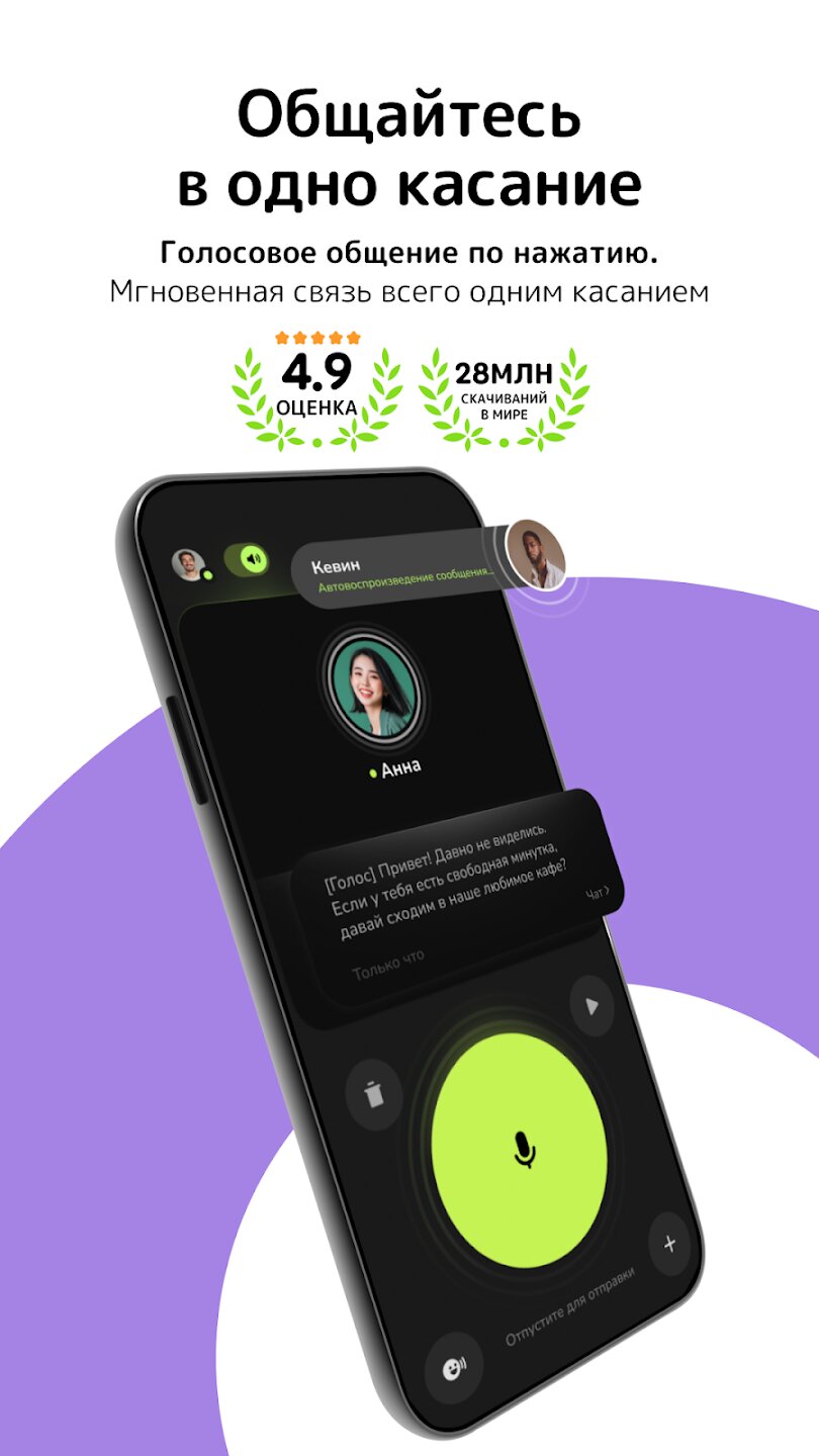 - Мгновенные голосовые сообщения с функцией «нажмите, чтобы говорить».