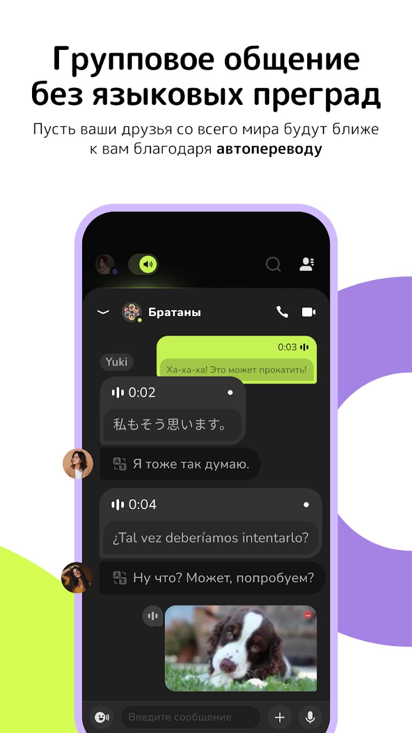 - Перевод в реальном времени в групповых чатах (более 26 языков).