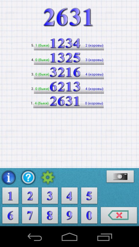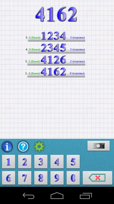 Пример:Пусть загаданное число - 1234. Если пользователь введет попытку 3658, то получит такой ответ: (1,0) — одна цифра угадана, и ни одной не угадано на правильно месте. Далее пользователь вводит: 0394, ответ: (2,1) — две цифры угадано и одна из них на своем месте.