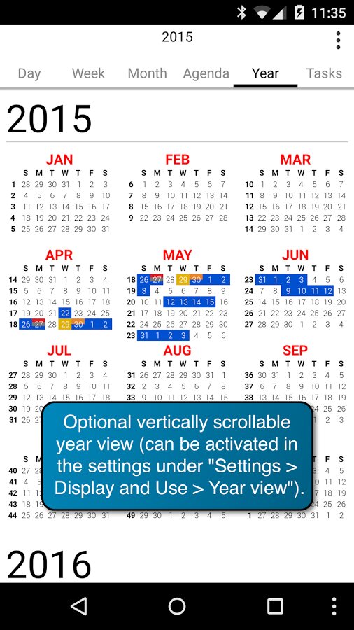 — Added an optional year view («Settings», «Display and Use», «Year view», «Enabled»)