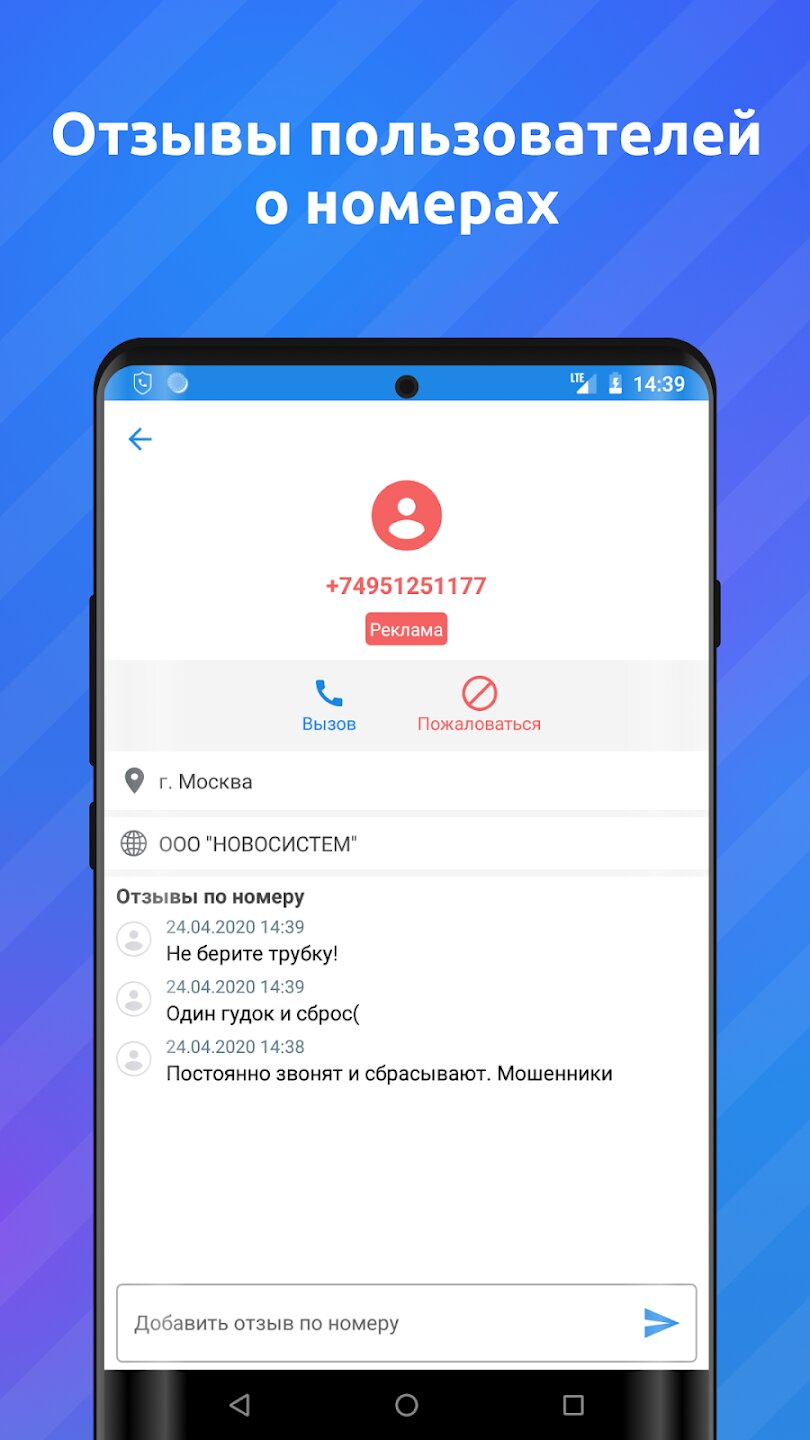 - Просмотр отзывов и оценок пользователей о неизвестных номерах