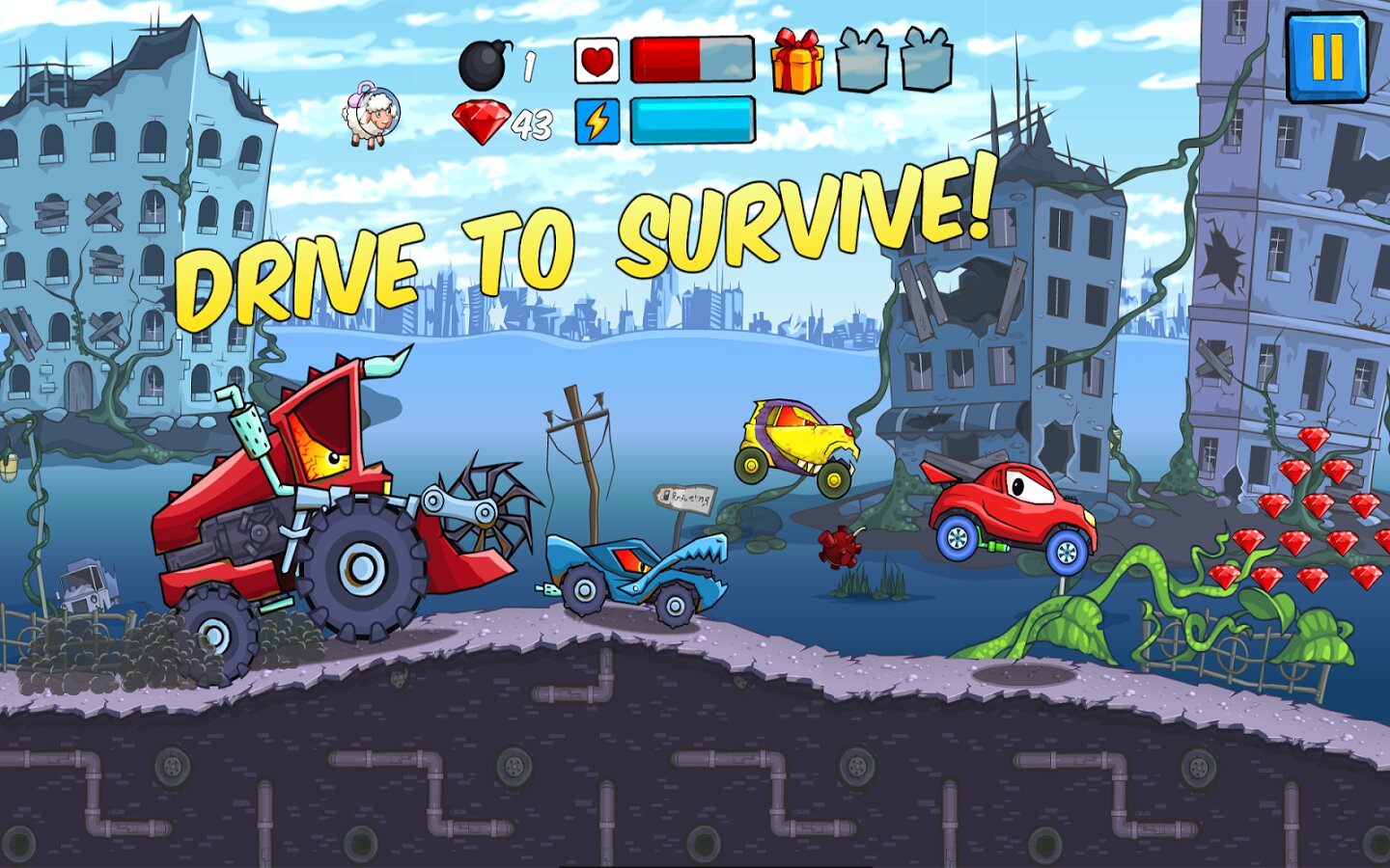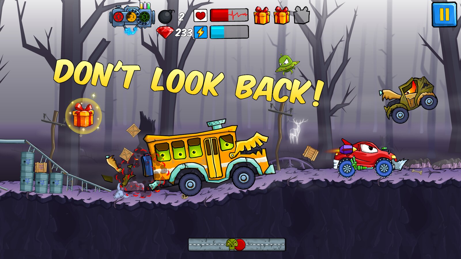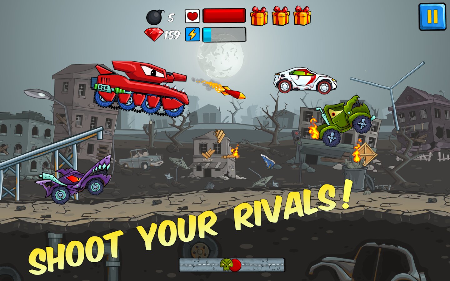 По мере прохождения игры игроки могут зарабатывать монеты, чтобы улучшать свои автомобили и открывать новые уровни. В игре также есть битвы с боссами против гигантских вражеских машин, добавляющие эпические разборки к и без того напряженному игровому процессу.