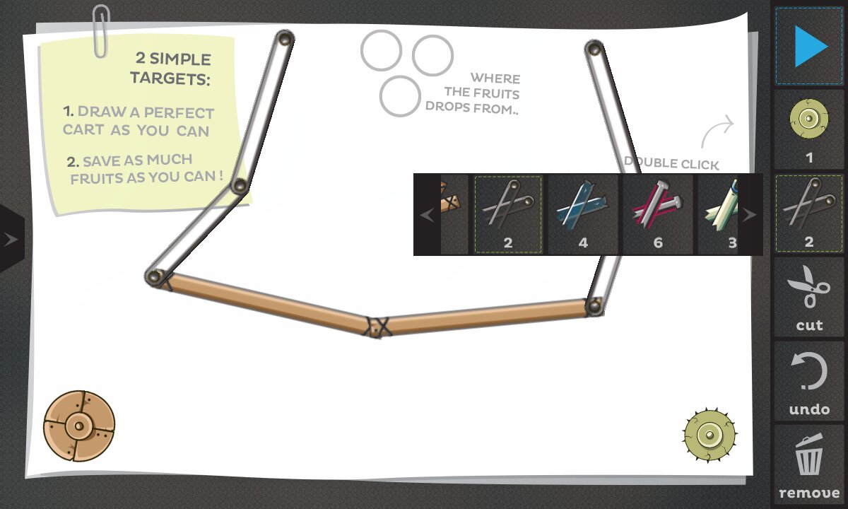 Ну, прежде всего, вы можете собрать какое угодно транспортное средство — на одном колесе, на двух, на трех или даже целый танк. А затем вы нагружаете свой транспорт фруктами и перевозите их до пункта назначения так быстро, как это возможно (при этом нужно уронить как можно меньше фруктов). От аккуратности и скорости зависит кол-во очков, которые вы получите.