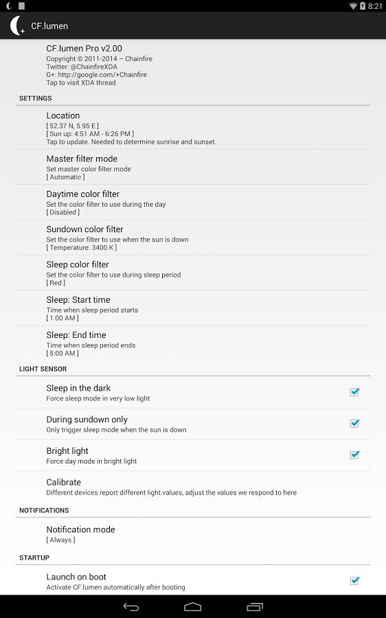 Приложение CFlumen адаптирует общую цветовую схему операционной системы Android в зависимости от текущего времени и положения солнца. Например вечером ваш интерфейс будет слегка желто-золотистый, повторяя вечерний свет от солнца, а утром — яркий и почти красный. Стоит отметить, что приложение CF.lumen также использует стандартный датчик освещения, который присутствует в большинстве мобильных устройств. С помощью этого модуля программа подстраивает цвет интерфейса под освещенность, например ночью вы не увидите полностью темного экрана. Кроме того, CF.lumen сохраняет энергию аккумулятора вашего устройства с помощью специальных цветовых фильтров.