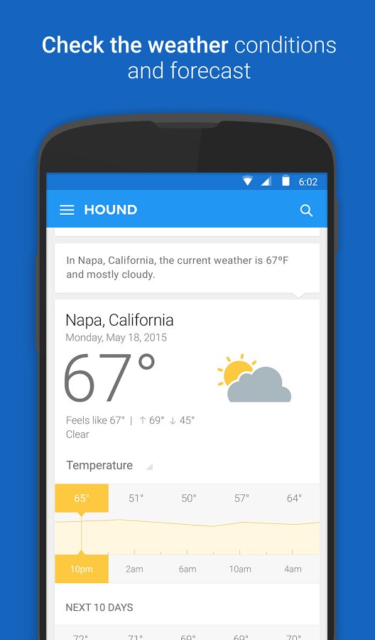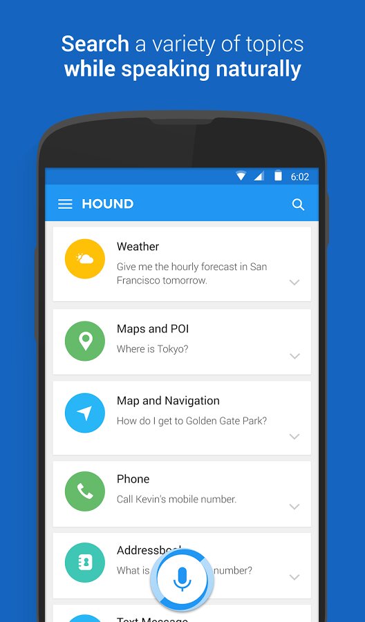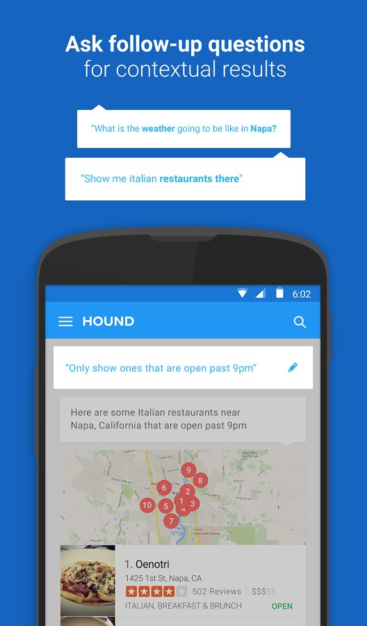 - «Привет, SoundHound… Будет ли дождь в Напе в среду?» … «Какую винодельню в Напе мне нужно посетить, если я люблю Рислинг?» … «Какие там есть места для завтрака, где можно посидеть на открытом воздухе?» … «Сколько времени нужно, чтобы доехать до третьего из Окленда?»