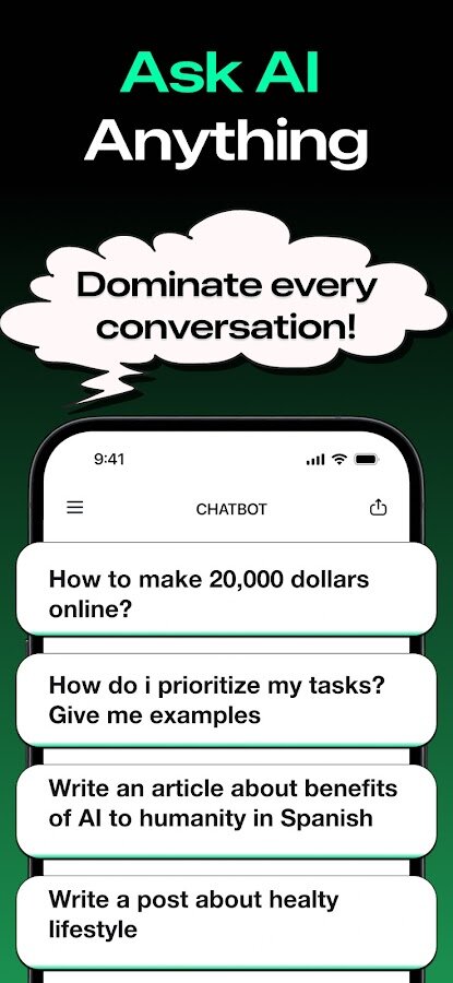 Chatbot – AI Smart Assistant способен создавать статьи, письма, песни, изображения, поддерживать диалог на любую тему и даже мотивировать к здоровому образу жизни. Благодаря современным языковым моделям и интуитивному интерфейсу, вы можете взаимодействовать с ИИ без ограничений и на любом устройстве. Идеален для студентов, специалистов, творческих пользователей и просто тех, кто хочет расширить возможности повседневного общения.