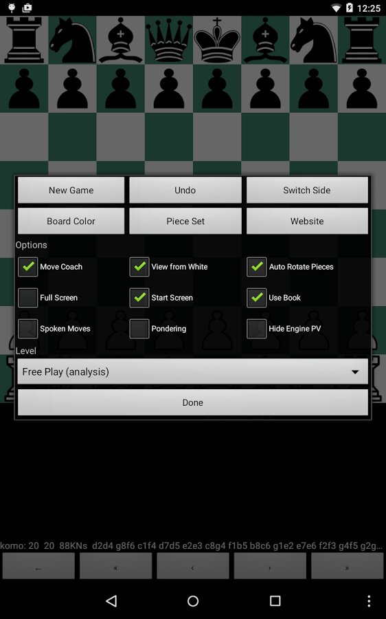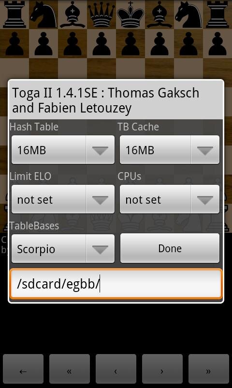 Приложение поддерживает универсальный шахматный интерфейс (UCI) и коммуникационный протокол Chess Engine (WinBoard и XBoard), что позволяет пользователям играть против более мощных сторонних движков или даже участвовать в турнирах между движками. Движки импортируются в формате Android Open Exchange (OEX), в формате, совместимом с Android Chessbase, или напрямую с SD-карты. Настройка движка включает контроль времени, обдумывание, бесконечный анализ, хеш-таблицы, несколько потоков, базы таблиц эндшпиля и открытие наборов тестов.
