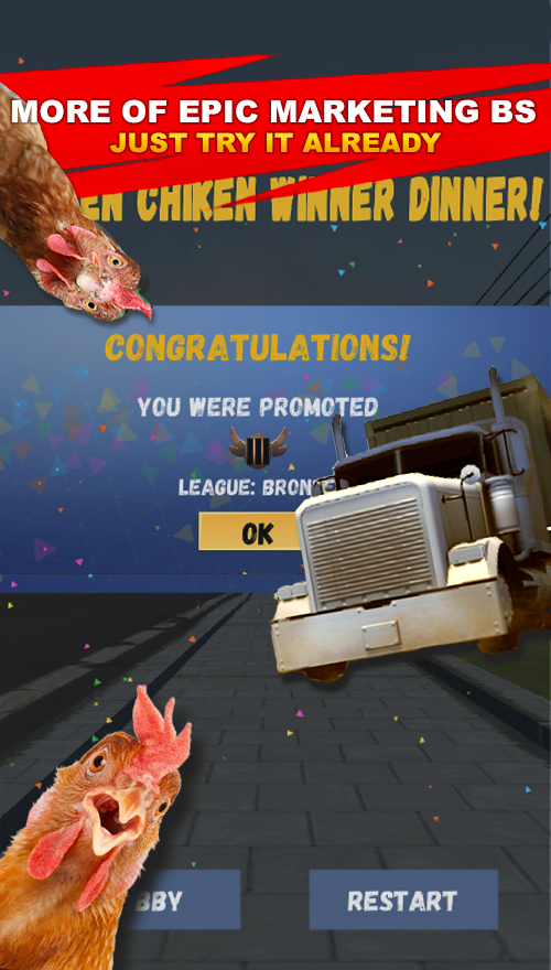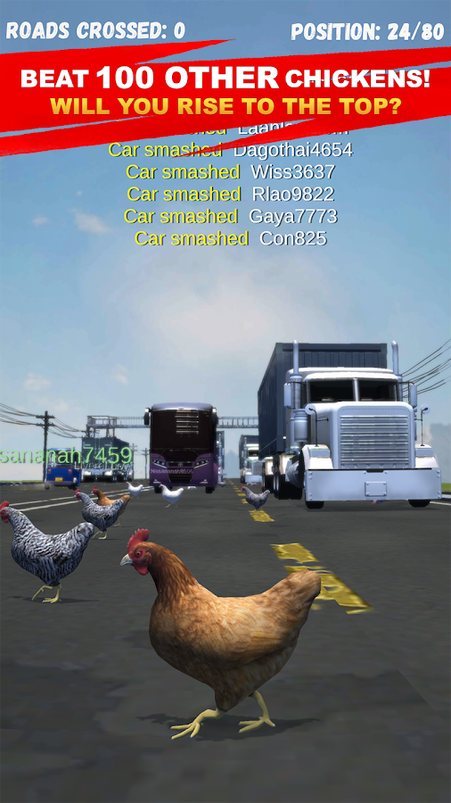 Симулятор курицы 🐥 3D — вам необходимо перевести курицу через автомагистраль с большим транспортным потоком. Пользователь получит возможность победить в матче с участием множества других куриц. Для этого нужно вести курицу через дорогу, вовремя останавливаться и не попадать под колеса. Попутно тут также можно собирать бонусы. Всего в матче может принять участие до сотни куриц одновременно, и только мастерство с каплей везения поможет победить их всех.