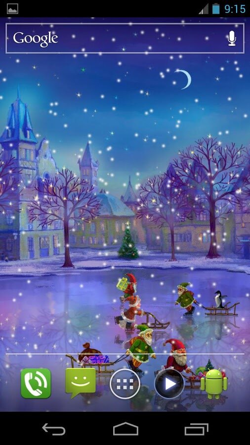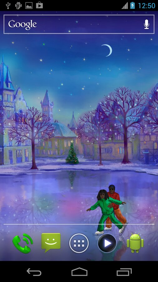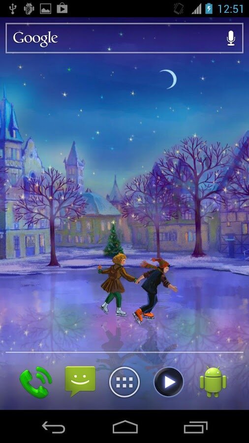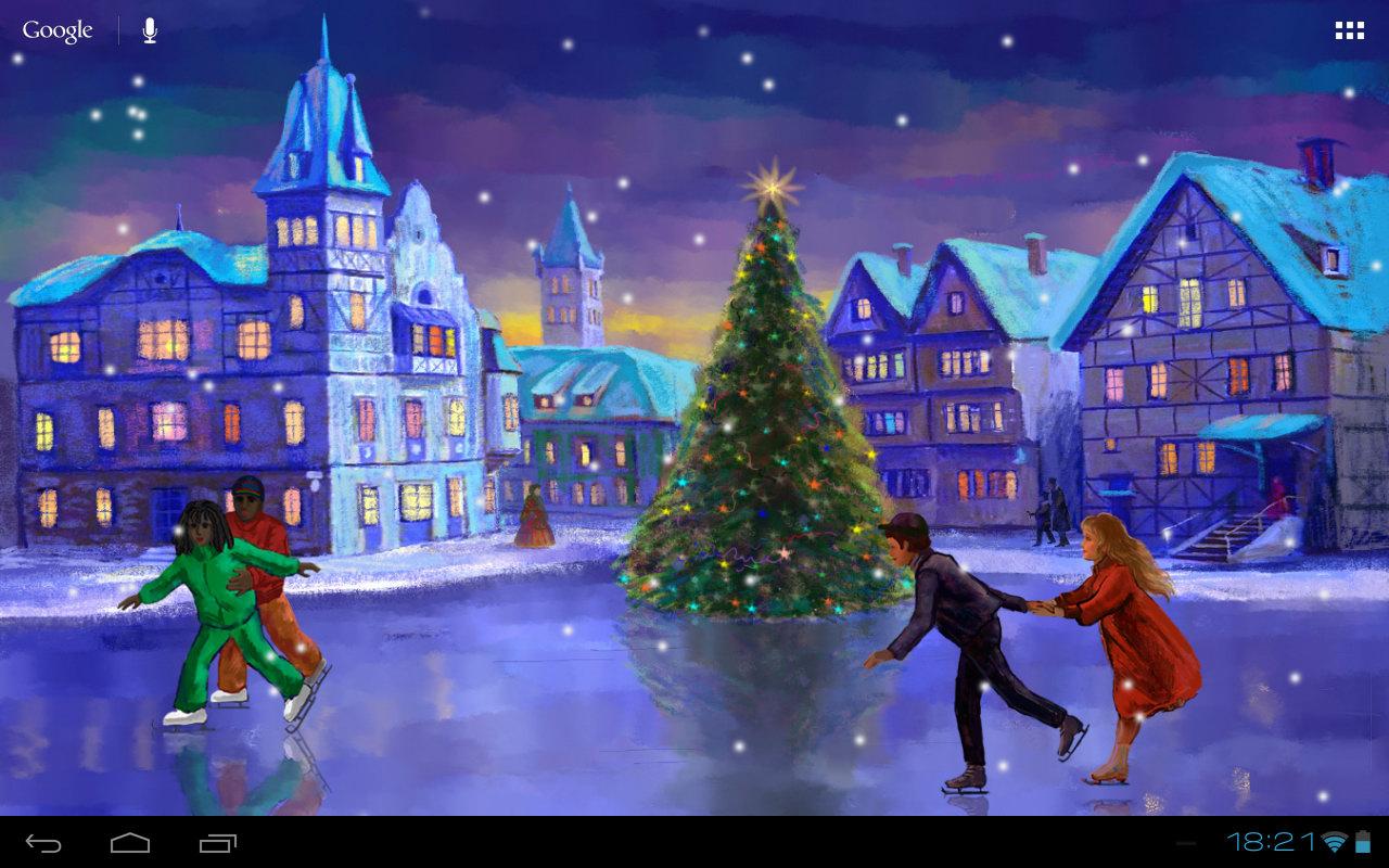 Christmas Rink — Чудесные новогодние живые обои с видом на прекрасный каток, расположенный на центральной площади сказочного городка, где вокруг новогодней елки катаются веселые детишки, Санта Клаусы, влюбленные пары, и другие нарисованные персонажи.