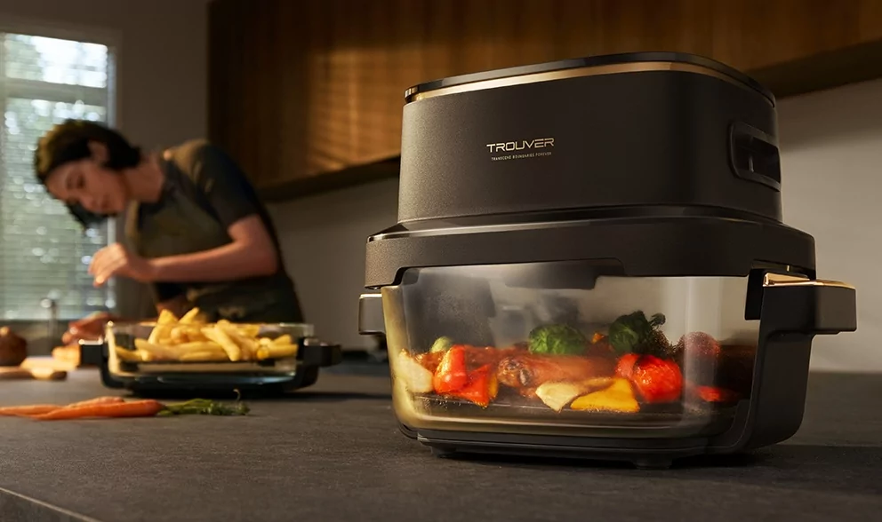 Аэрогрили ценятся сторонниками здорового питания, потому что готовят потоками горячего воздуха — это обеспечивает хрустящую корочку, как из фритюра, но без добавления масла, а образующийся в процессе приготовления жир и вовсе стекает вниз (если использовать гриль-решётку). У TROUVER есть интересная модель в лице AF20 Pro, предлагающая две сменные чаши. Они разного размера, что делает аэрогриль куда универсальнее в использовании: большая посудина на 4 литра подходит для семейных обедов, а малая на 2,5 литра оптимальна для быстрого приготовления компактных порций. При этом обе ёмкости стеклянные, благодаря чему можно не открывать крышку, теряя тепло, для проверки готовности (если это хочется контролировать вручную) — всё видно через прозрачные стенки.