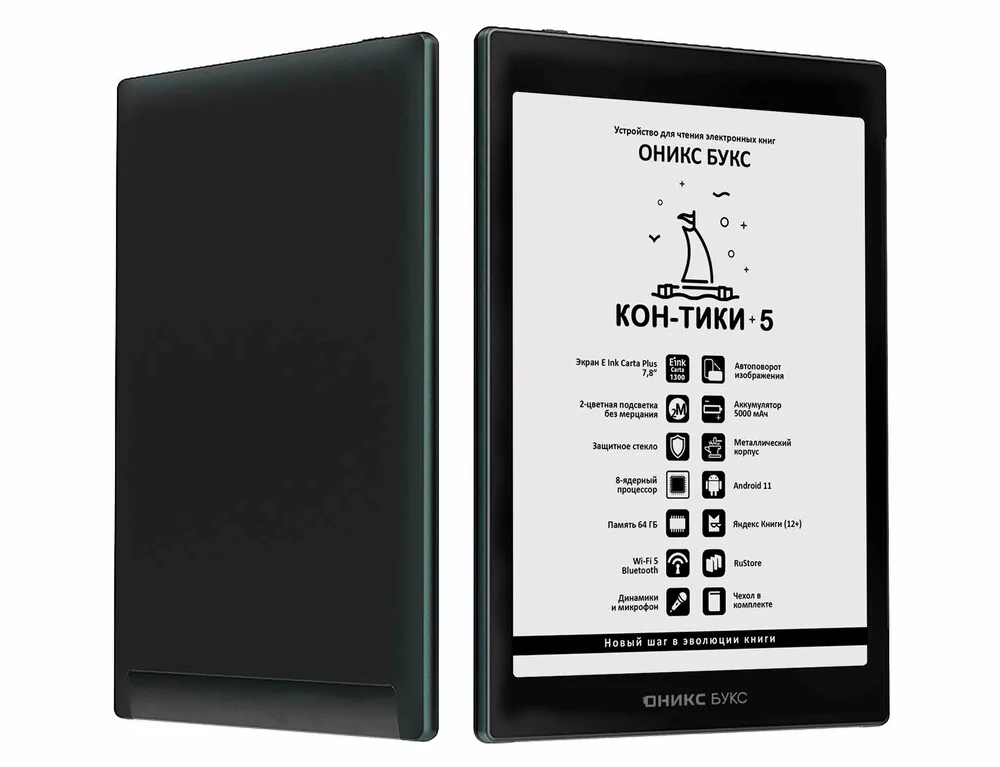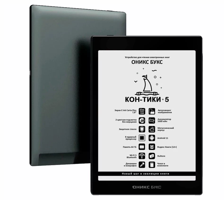 Особенность именно этой модели в том, что она одна из самых универсальных. Во-первых, здесь дисплей на 7,8 дюйма — на нём помещается больше контента, чем на 6-дюймовых «малышах», но при этом он не настолько огромен, как в моделях с ориентировкой на чтение A4-документов и чертежей. Во-вторых, «ОНИКС БУКС Кон-Тики 5» получил полноценный Android 11, так что на него в случае необходимости можно установить любые стандартные приложения, в том числе любимые ридеры или клиенты онлайн-библиотек. В-третьих, «Кон-Тики 5» в каталоге производителя находится в среднем ценовом сегменте, так что он лучше самых базовых моделей, но при этом не настолько дорогой, как топовые варианты, возможности которых могут быть излишними.