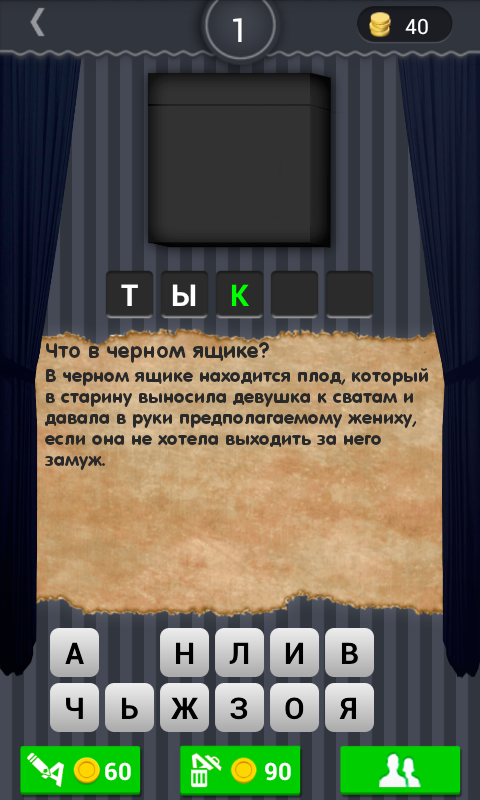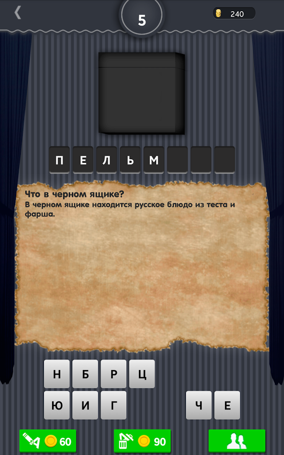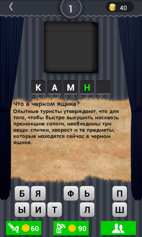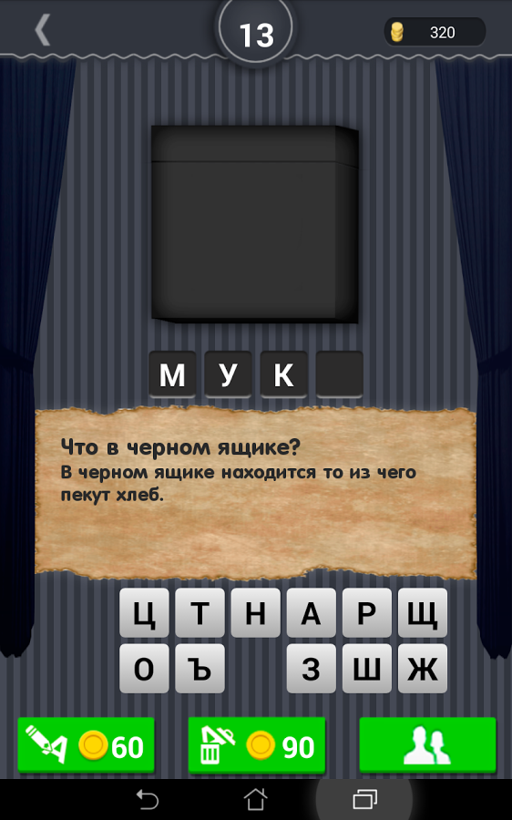 В игре нужно прочитать вопрос или загадку и догадаться что спрятано в черном ящике. Если вопрос слишком сложный для Вас, тогда на помощь придут подсказки «Удалить ненужные буквы» или «Вставить правильную букву», также можно попросить помощи у друзей.