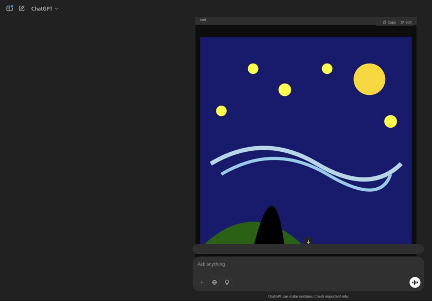 Например, когда я попросил оба сервиса создать SVG-версию известной картины, ChatGPT поначалу отказался выполнять действие из-за авторских прав. Claude же без лишних вопросов создал изображение, ещё и анимированное. Ниже можете сравнить итоговые результаты от Claude Sonnet и ChatGPT версий 4o и 4.5.