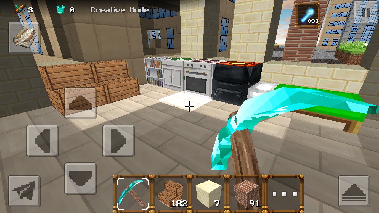 Управление достаточно простое и интуитивное. В левой части экрана находится кнопка передвижения, в правой – прыжок и использование инструмента. Как и в оригинальной песочнице, из подручных материалов выстраивается целый дом, который обставляется по последнему слову техники. Порой создается впечатление, что над игрой постарался большой оригинал, добавив сюда не только стандартные кирки и мечи, но и огнестрельное оружие, стиральные машины и холодильники.