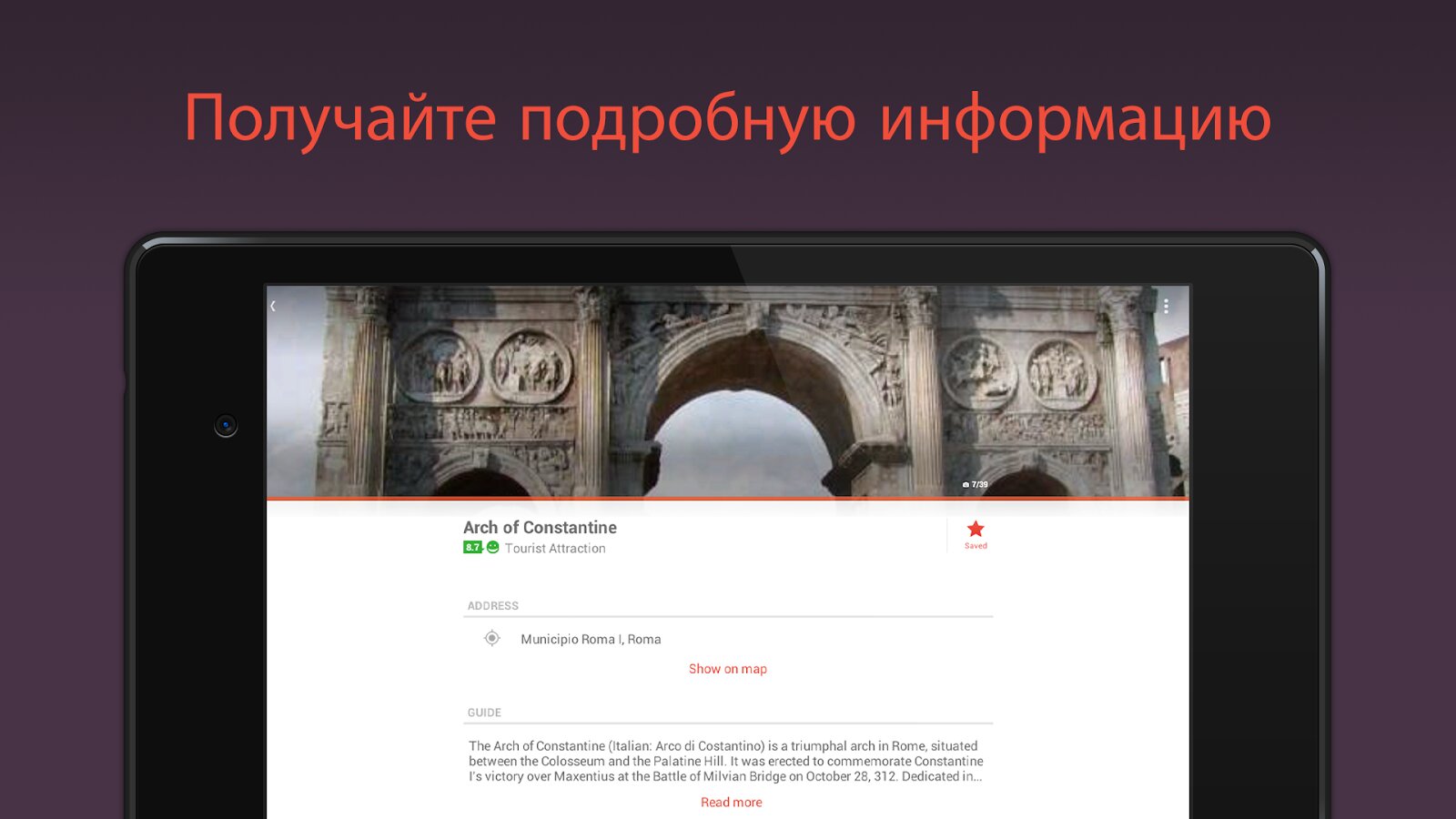 - ДЕТАЛЬНАЯ ИНФОРМАЦИЯ. Держите всё, что вам нужно, прямо у себя в кармане. По каждому маршруту мы предоставляем полную и актуальную информацию о тысячах мест, достопримечательностей и прочих объектов. Мы собрали эти данные из лучших источников в Интернете и подготовили для удобного использования на смартфоне или планшете.