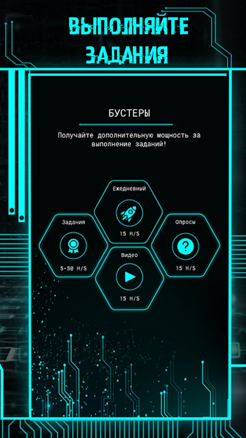 - Симулятор майнинга не требует специальных навыков и дополнительных настроек. Процесс запускается одним нажатием кнопки! Используйте ежедневные бустеры, чтобы увеличивать скорость каждый день и добиться результата быстрее всех!