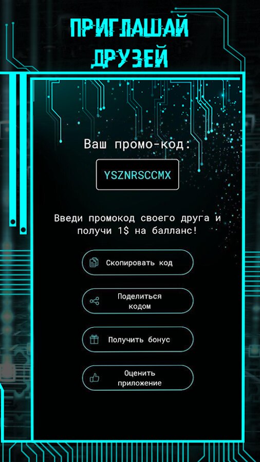 - Реферальная система: получайте виртуальные бонусы за приглашенного пользователя, на игровой счет.