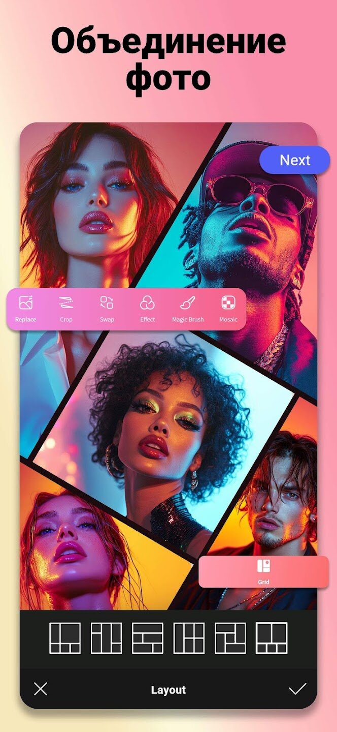 Основная функциональность приложения заключается в его надежном инструменте для создания коллажей. Вы можете легко объединить до 9 фотографий, выбирая из множества шаблонов и макетов сетки. Редактор дает вам полный контроль над поворотом изображений, настройкой границ, настройкой цветов фона и применением фильтров. Отличительной особенностью является специальный режим «Картинка в картинке» (PIP), который предлагает креативные рамки различных форм и стилей для создания привлекательных многослойных фотоэффектов, идеально подходящих для любого случая, от свадеб до дней рождения.