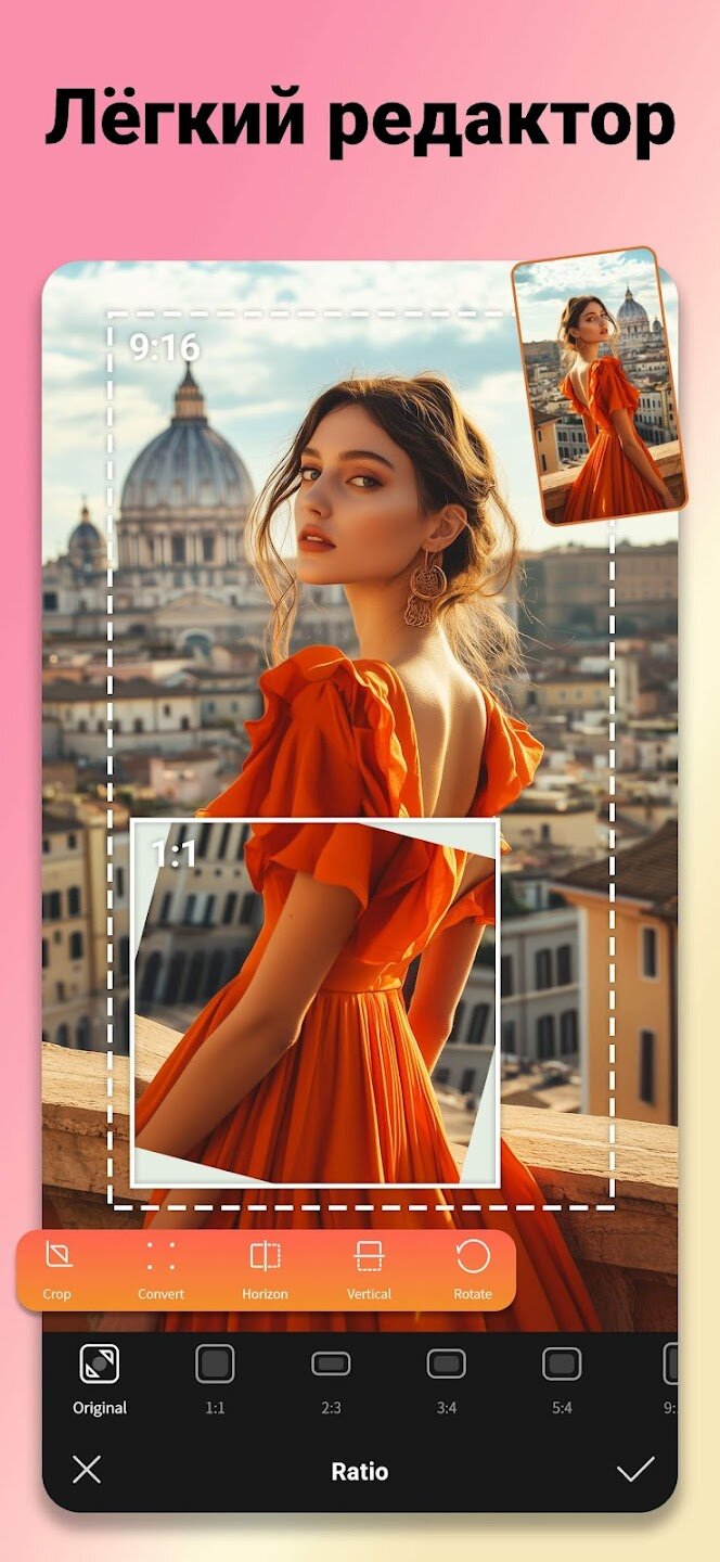 - Полный набор инструментов для редактирования: обрезка, поворот и настройка границ.