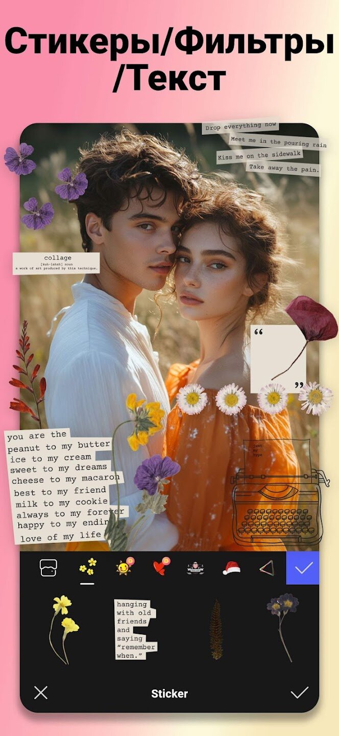 - Обширная библиотека фильтров, стикеров, смайликов и стилей текста.