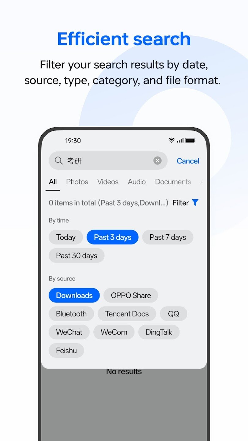 Основная функция My Files — интеллектуальная автоматическая категоризация, которая аккуратно организует ваши файлы в отдельные группы, такие как «Фотографии», «Видео», «Аудио», «Документы», «APK» и «Архивы», для удобного доступа. Помимо просмотра, мощная функция поиска позволяет фильтровать результаты по нескольким критериям, включая дату, источник, тип, категорию и конкретный формат файла, помогая вам найти именно то, что вам нужно, за считанные секунды.