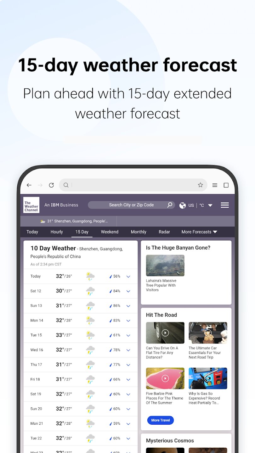- Подробные почасовые и 15-дневные прогнозы погоды.