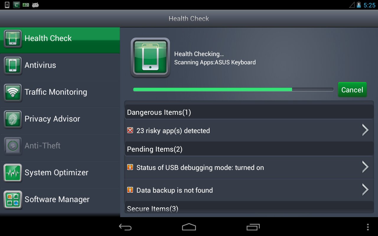 2. Одним прикосновением сканирует и сканирование по расписанию предусмотрено, а также система «Health Check», которая быстро идентифицирует вирусы, небезопасные приложения и потенциально опасные настройки.
