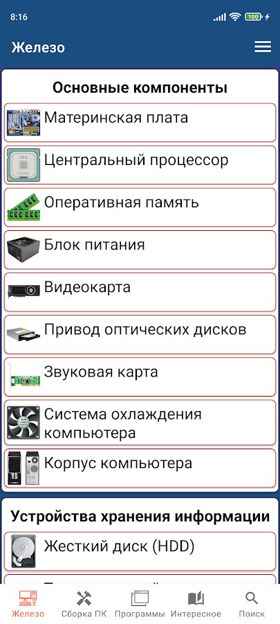 ■ В первом разделе содержится информация обо всех компонентах компьютера, а также о периферийных устройствах и другом компьютерном оборудовании. Базовая теория о компьютерных компонентах, написанная простым языком. Здесь располагаются статьи о материнской плате, центральном процессоре, оперативной памяти, видеокарте и других составляющих компьютера.