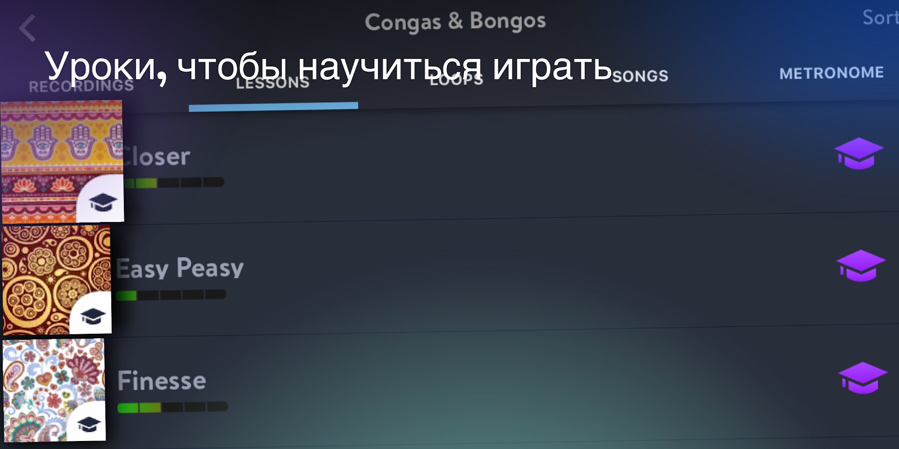 - В Congas & Bongos есть несколько уроков с видеоуроками, которые помогут вам. Кроме того, в приложении есть множество циклов различных музыкальных стилей, с которыми можно играть вместе.