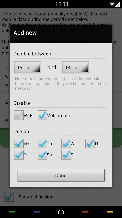 Connectivity Manager – небольшая утилита для управления Wi-Fi интернет подключением. По сравнению с другими менеджерами данная программа имеет набор дополнительных функций: программа умеет вести подсчет трафика и выключать Wi-Fi модуль по расписанию. На мой взгляд, для экономии энергии полезной опцией является «выключение модуля на ночь».