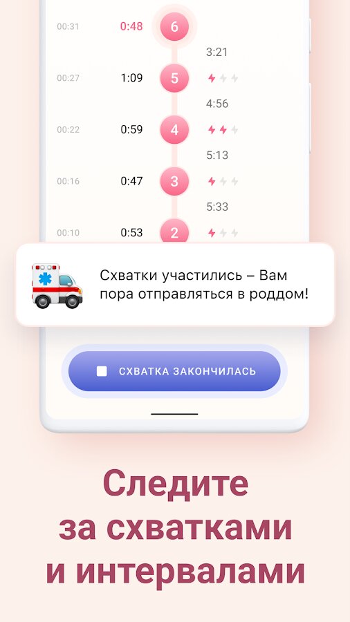 Это приложение не предоставляет медицинские консультации. Наши рекомендации основаны на стандартных показателях. Ваши роды могут протекать по-другому. Всегда консультируйтесь с врачом, чтобы сориентироваться в частоте и продолжительности схваток.