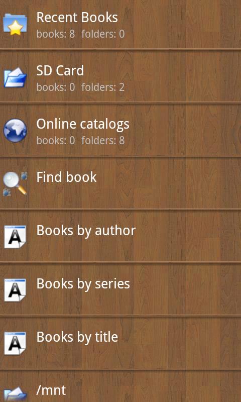 выбор файла для открытия через встроенный файл браузер или из внешнего файл-менеджера список последних открытых файлов изменение шрифта, использование пользовательских шрифтов, размера шрифта, жирность, инверсия сглаживание шрифтов поддержка внешних файлов CSS (Cool reader WiKi CSS) листание книги джойстиком/сенсорным экраном/клавишами громкости переход на страницу по номеру и проценту закладки содержание книги поиск текста анимация перелистывания страниц (как в бумажной книге или сдвиг) обложки книг в списке книг поворот изображения по сенсору отдельное меню по кнопке меню в списке книг текстуры фона страницы настраиваемые действия по тап-зонам настраиваемые действия кнопок возможность блокировки сенсорного экрана и трекбола автоповтор листания поддержка установки на SD для 2.2 переход по ссылке — длинным нажатием, возврат — через меню или по назначенному на кнопку или тап-зону действию вход в режим выделения текста — через меню (можно также назначить на кнопку или тап-зону) опционально выделение текста — по двойному тапу выделенный текст копируется в буфер обмена поиск слова в словаре — Fora Dictionary или ColorDict настройка яркости скольжением вдоль левого края экрана сортировка книг в браузере файлов по имени, автору, названию, времени создания файла