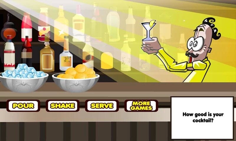 Хотите почувствовать себя в роли бармена? Всю игру вам предстоит делать разные напитки, как алкогольные, так и экзотические, но сначала нужно открыть все бутылки. Открываются они за определенный коктейль и действия. Кроме интересного игрового процесса разработчики добавили смешную анимацию героя — бармена Мигеля. Он то и дело что-то чудит, а заодно веселит.