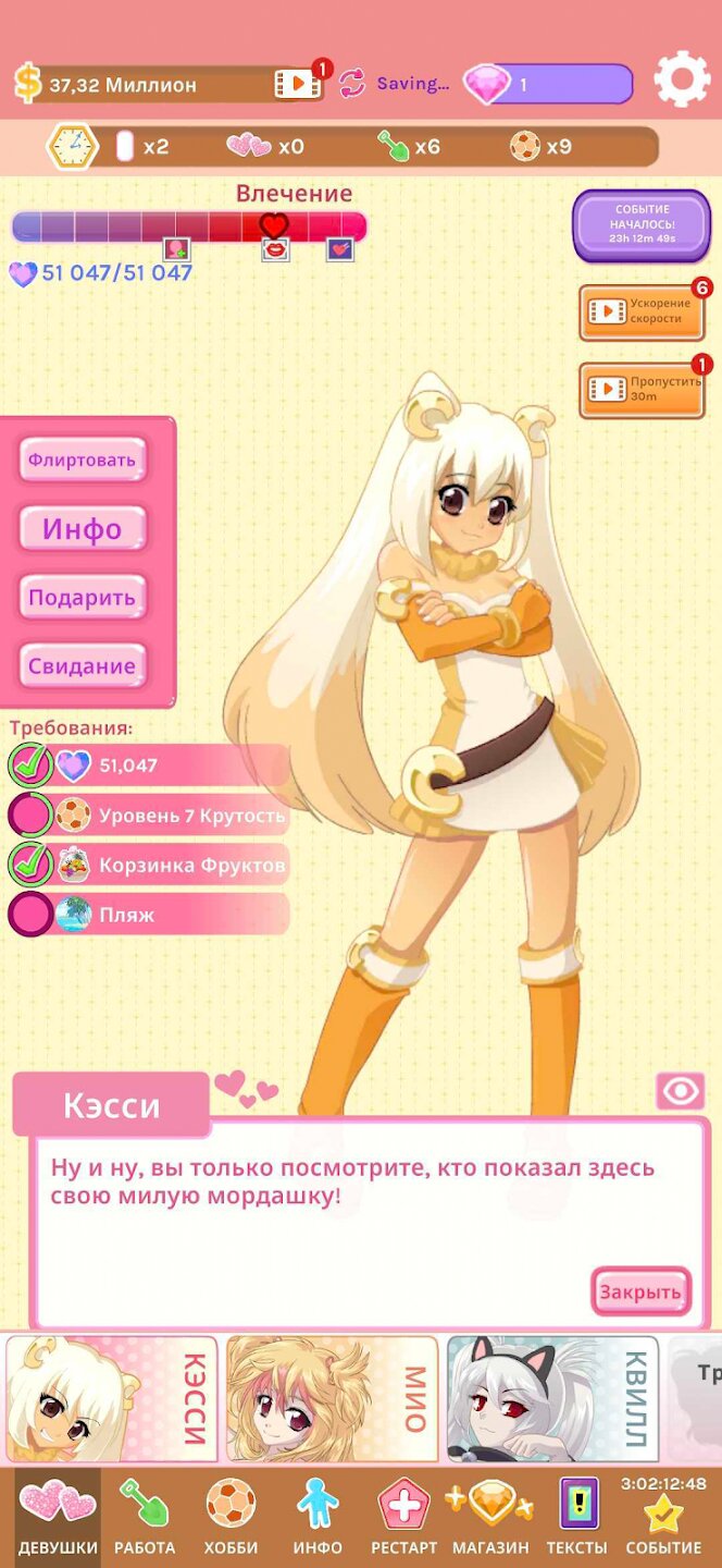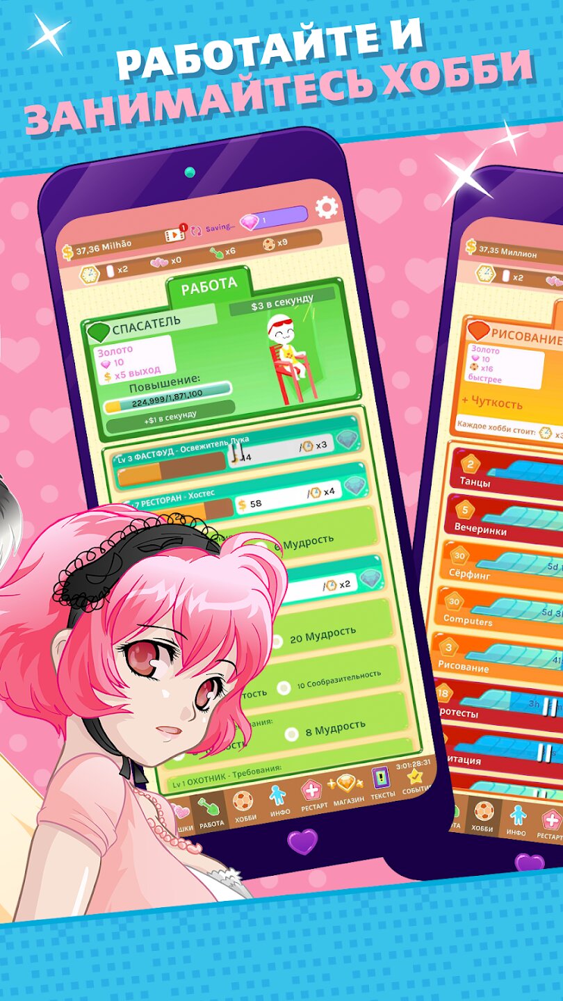 Погрузись в легкую и остроумную романтическую историю, где тебе предстоит знакомиться с очаровательными персонажами, развивать отношения и покорять сердца. Улучшай свои навыки, устраивайся на престижные работы и находи время для хобби, чтобы стать идеальной партией для любой из девушек. Игра сама продолжит зарабатывать ресурсы, даже когда ты offline, позволяя вернуться к новым достижениям и возможностям.