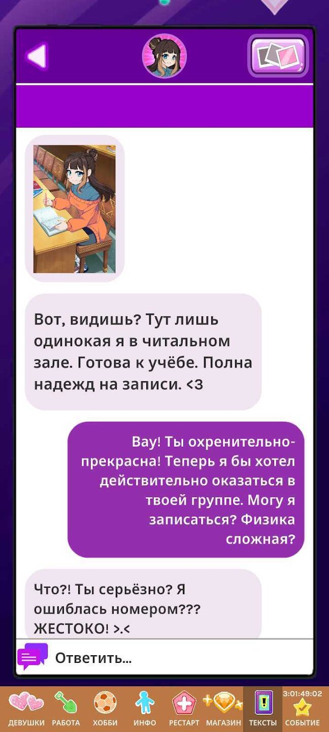 Исследуй насыщенный контент: открывай уникальные наряды, коллекционные карточки и секретные концовки для каждого персонажа. Механики прокачки и стратегического планирования времени добавляют глубины классическому формату визуальной новеллы. Динамичный геймплей и юмор не дадут заскучать.