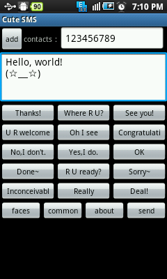 Cute SMS — приложение, с помощью которого вы сможете использовать графику в SMS. Графические послания состоят из набора символов. В приложении предоставлены на выбор готовые блоки, из которых можно построить более сложные конструкции. Кроме того, в приложении предложен набор часто используемых фраз, которые можно вставить в сообщение одним кликом.