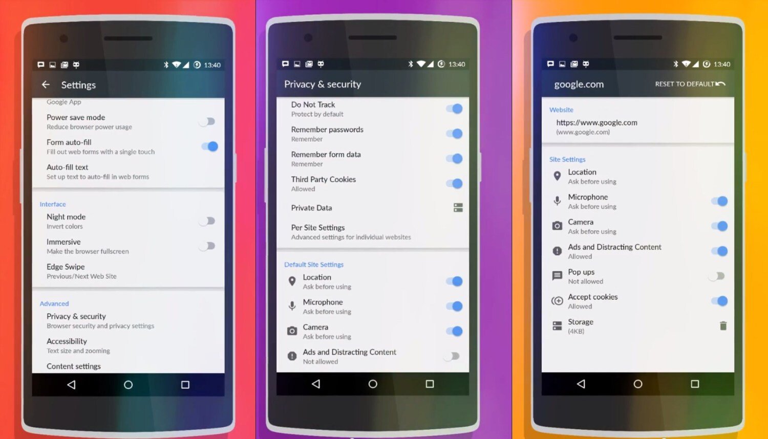 По попавшим в ролик настройкам видно, что Cyanogen Gello позволит владельцу смартфона или планшета запретить каждому конкретному сайту доступ к тем или иным функциям гаджета (камере, микрофону, GPS). Здесь же пользователь сможет отключить всплывающие сообщения, рекламу и заблокировать создание «куки». Последним пунктом значится удаление всей хранимой сайтом информации на устройстве.