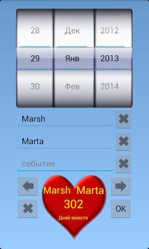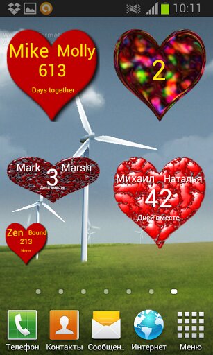 Days together widget — это Виджет для вашего домашнего экрана, который ведет отчет дней. Инструкцию по установке виджета в картинках- можно посмотреть запустив виджет как обычное приложение. Если вы забываете даты или просто хотите каждый день видеть сколько вы и любимый(любимая) пробыли вместе дней — поставьте «Дней вместе» виджет на рабочий стол вашего домашнего экрана. Этот оригинальный счетчик любви — украсит ваш домашний экран вашими именами и красивым символом любви — сердцем. Надеюсь, что этот красивый виджет любви вам понравится.