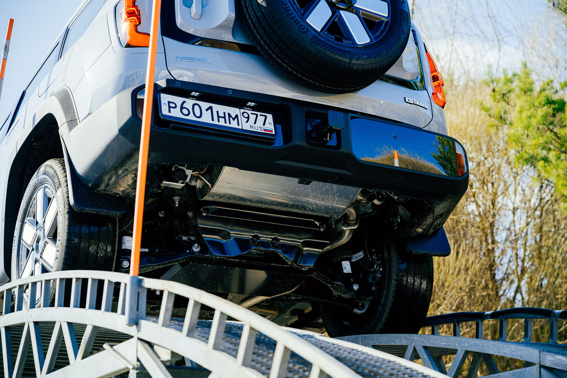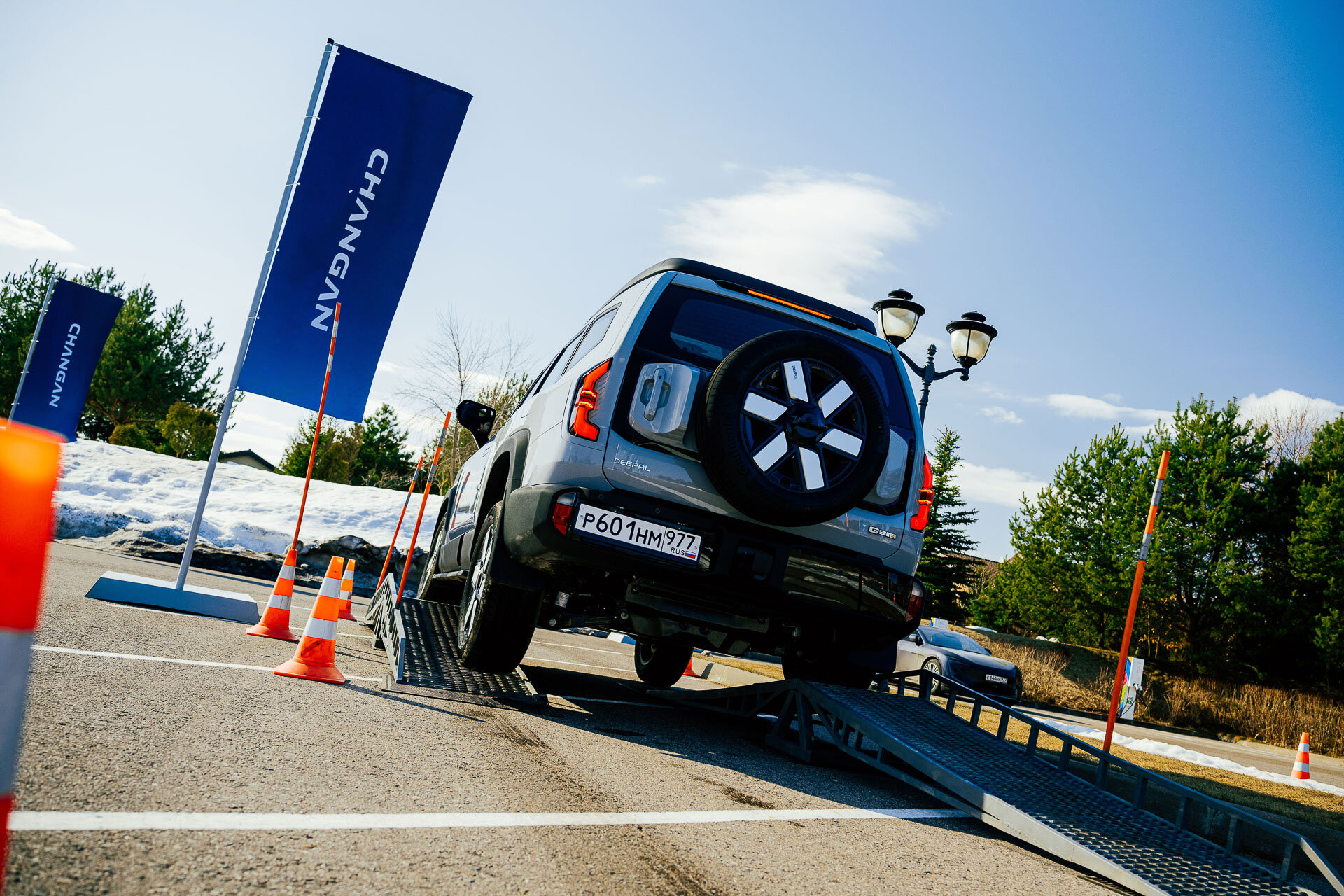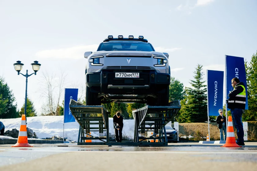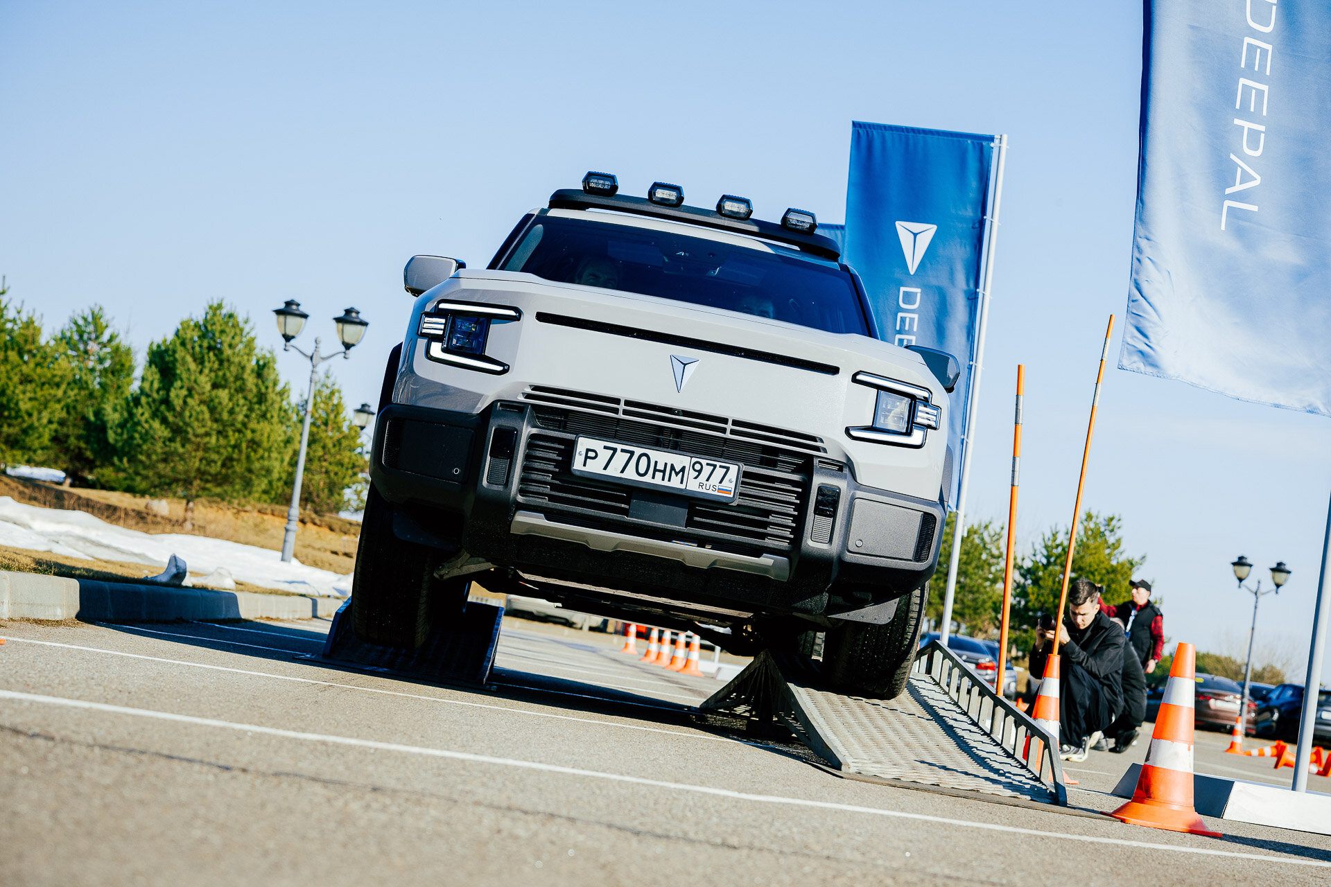 Вводные: клиренс до 240 мм (он меняется, ведь здесь пневмоподвеска); углы заезда: 27° спереди и 31° сзади. И по фото видно, что колёса находятся весьма близко к краям кузова. Справился ли Deepal с препятствиями? Играючи! Некоторые, и я в том числе, посетовали, что у нас не было возможности искупать его в грязючке… ведь ранняя весна — как раз самое то для этого. Но для таких процедур, по-хорошему, нужна и иная резина, а продаваться он будет на городской «обуви».