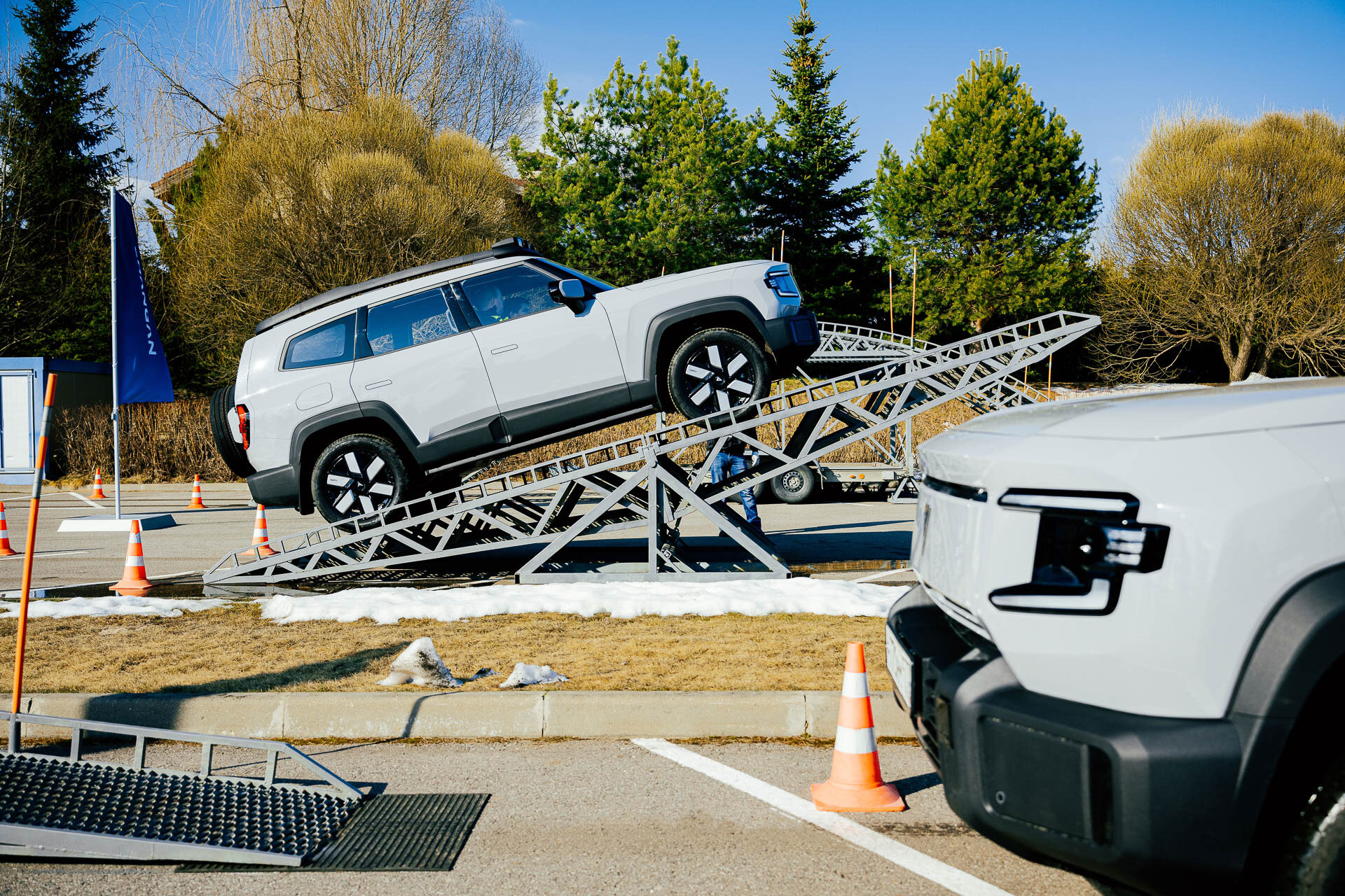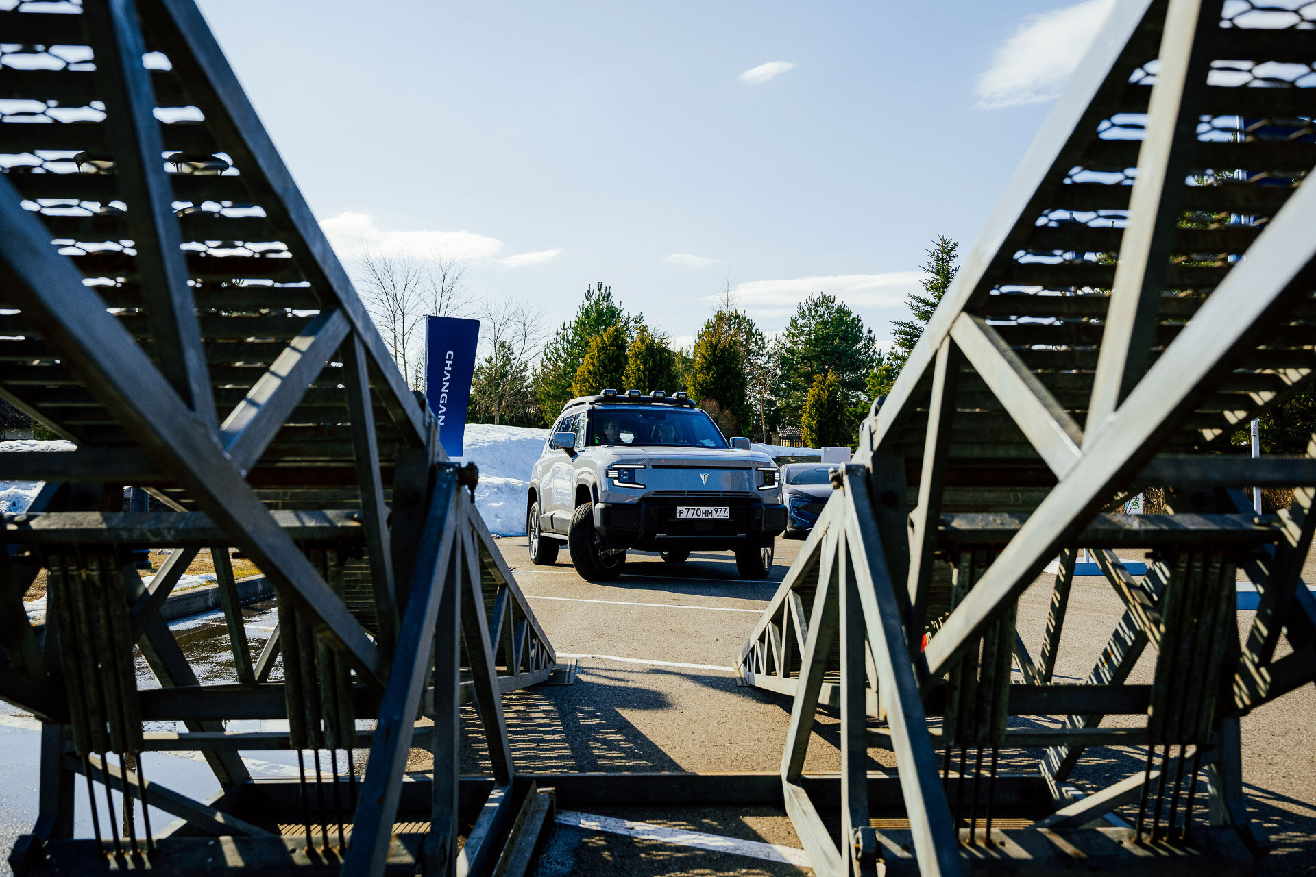 А я перемещаюсь на тот самый импровизированный полигон. Да, он весь асфальтовый с металлическими конструкциями, никто не отправлял лезть в лужи и грязь. Так что оценить получилось больше геометрическую проходимость и уверенность, с которой срабатывает полный привод при диагональных вывешиваниях.