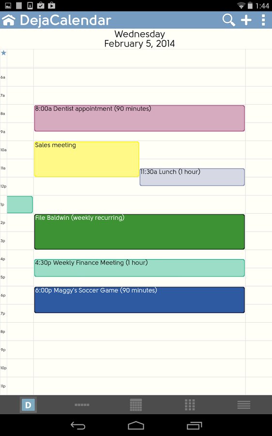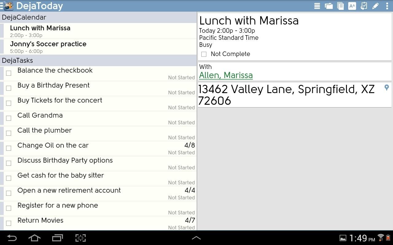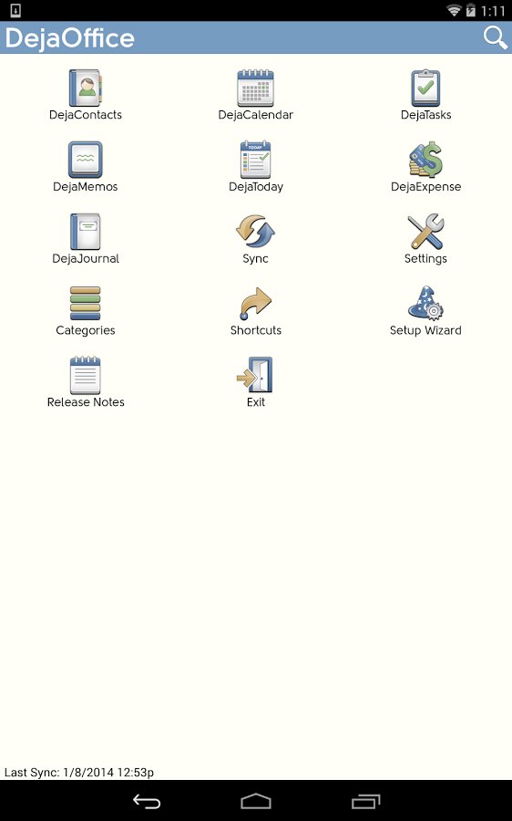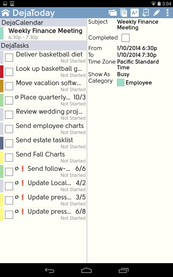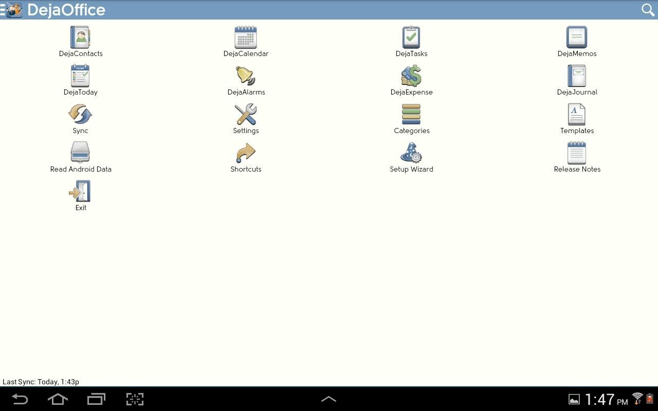 DejaOffice — Органайзер для Android со всеми аттрибутами — задачи, календарь, todo, записки, контакты. Программа позволяет синхронизироваться и с Google аккаунтом и с компьютером.