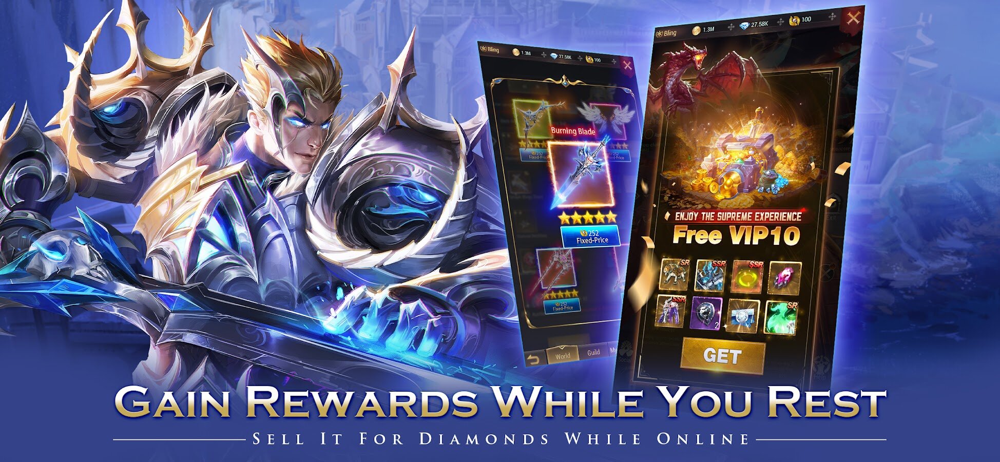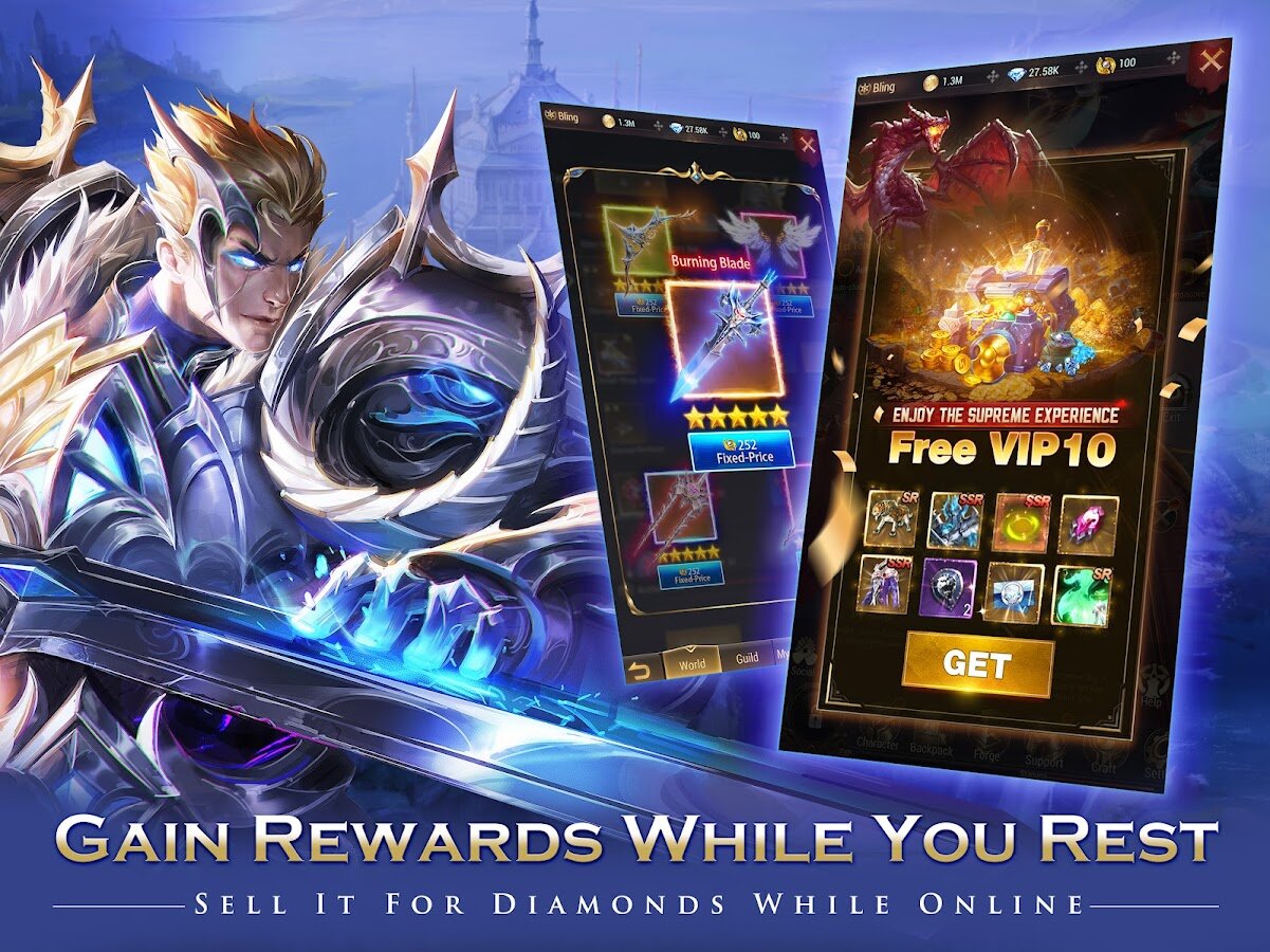 - Один клик AFK и бесплатный VIP10. Заработайте 100 тысяч Диа в первый же день и наслаждайтесь AFK-заработком. Торгуйте продвинутыми предметами по своему усмотрению на открытом рынке. Продавайте снаряжение за деньги и станьте лучшим игроком, не потратив ни цента.