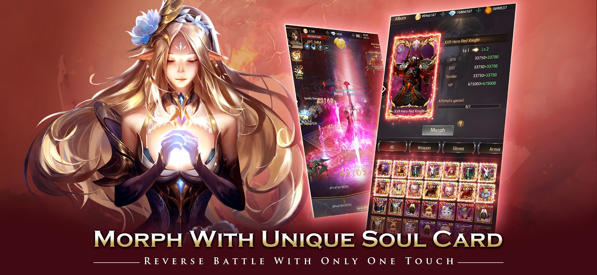 - Варгод Святого Света, Королева Клинков, Алый Кошмар… Сотни маунтов, последователей и магических существ в вашем распоряжении. Отправляйте их собирать карты душ, чтобы вы могли подбирать навыки по своему усмотрению, превращаться в богов и демонов во время битвы и громить противника!