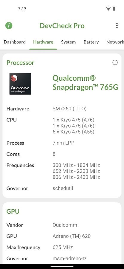 DevCheck Device & System Info — контролируйте аппаратное обеспечение в режиме реального времени и получайте полную информацию о модели устройства, CPU, GPU, памяти, аккумуляторе, камере, накопителе, сети, датчиках и операционной системе.