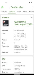 DevCheck предоставляет самую подробную информацию о процессоре и системе-на-чипе (SOC). Узнайте характеристики Bluetooth, GPU, оперативной памяти, накопителей и другого оборудования телефона или планшета. Узнайте подробности о Wi-Fi и мобильных сетях, включая информацию о двух SIM-картах. Получите данные датчиков в реальном времени. Узнайте об операционной системе и архитектуре вашего телефона. Полностью поддерживается Root, поэтому пользователи с рутом могут получить еще больше информации.