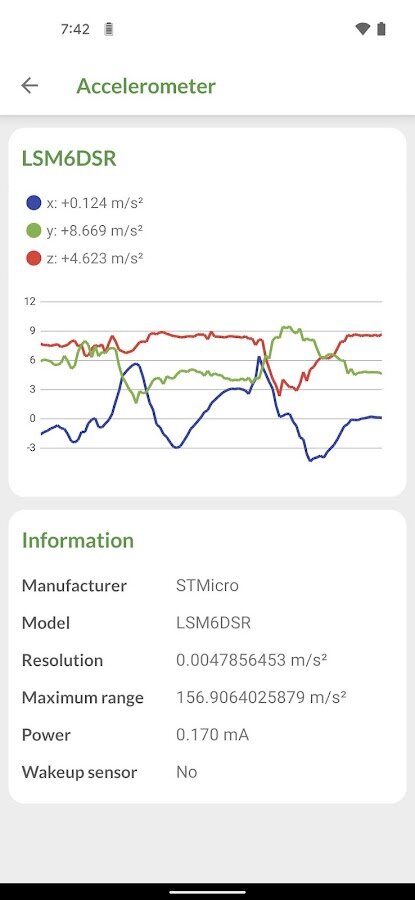 - Датчики: список всех датчиков на устройстве, включая тип, производителя, мощность и разрешение. Графическая информация в реальном времени для акселерометра, датчика шагов, гироскопа, приближения, освещенности и других датчиков.