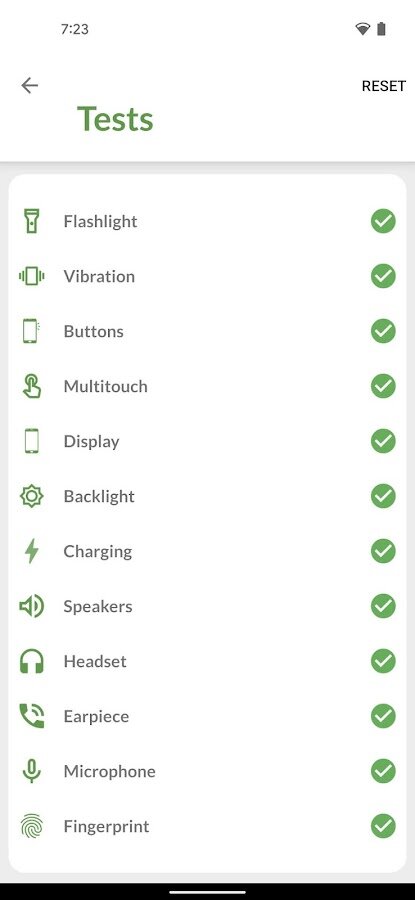 - Тесты: фонарик, вибратор, кнопки, мультитач, дисплей, подсветка, зарядка, динамики, гарнитура, наушники, микрофон и биометрические сканеры (для последних шести тестов требуется версия PRO).