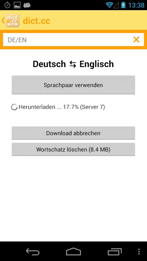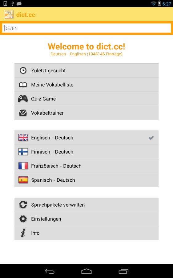 dict.cc — ENG-DE словарь-оффлайн в комбинации с другими языками. Словарь для 51 языковых комбинаций ENG-DE, можно использовать без подключения к Интернету (в автономном режиме словаря). Словари могут быть загружены и обновлены в течение приложение бесплатно.